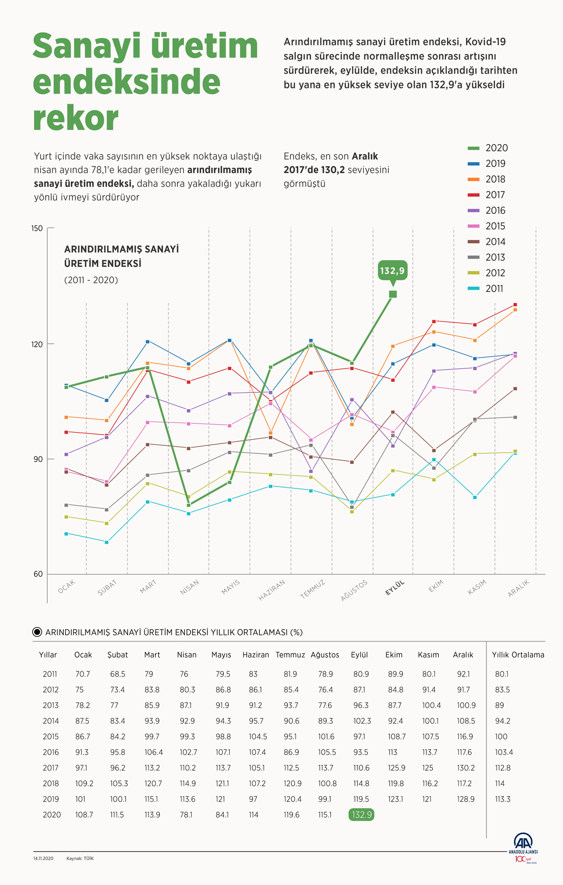 Arındırılmamış sanayi üretim endeksi, Kovid-19 salgın sürecinde normalleşme sonrası artışını sürdürerek, eylülde, endeksin açıklandığı tarihten bu yana en yüksek seviye olan 132,9'a yükseldi.