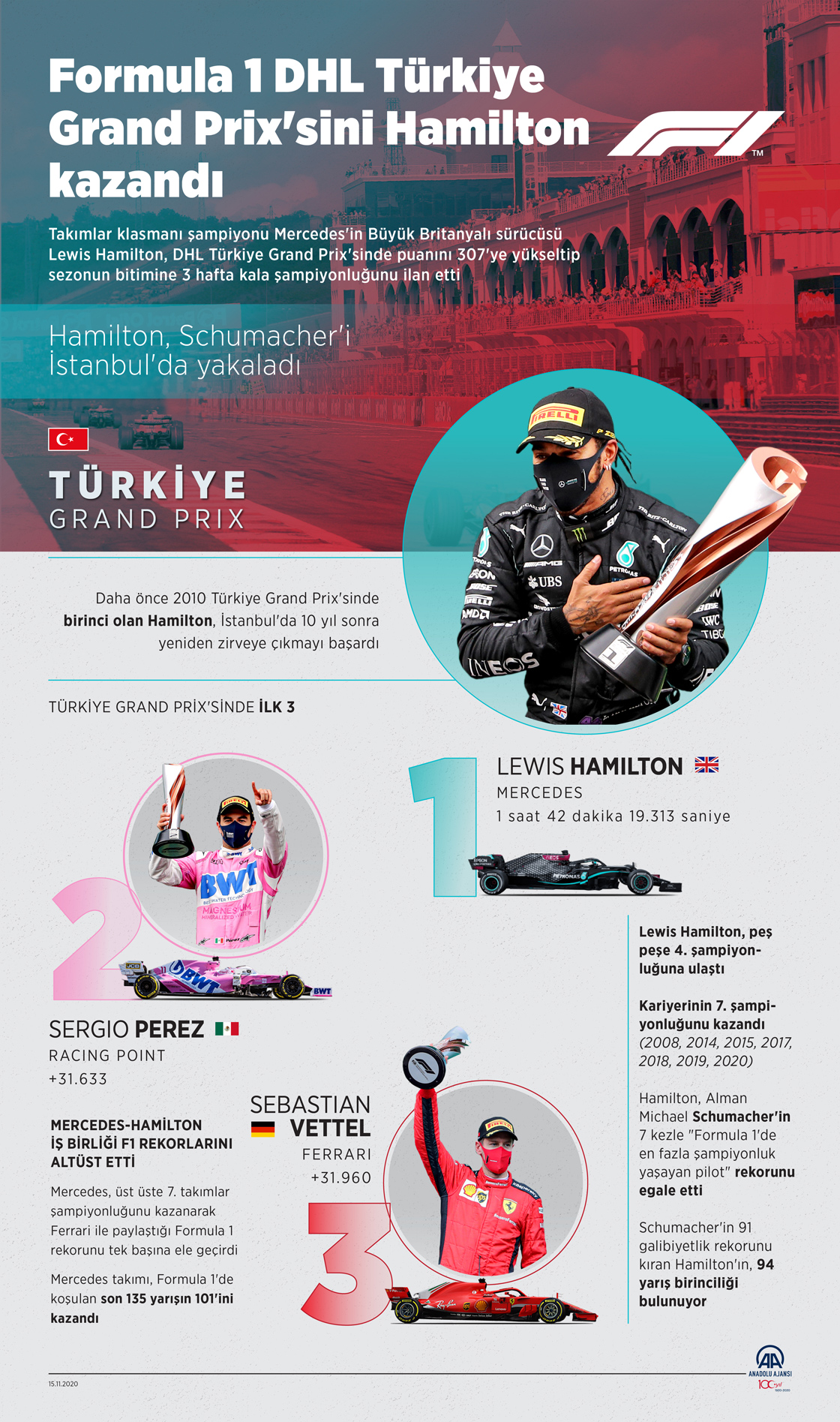 Takımlar klasmanı şampiyonu Mercedes'in Büyük Britanyalı sürücüsü Lewis Hamilton, DHL Türkiye Grand Prix'sinde puanını 307'ye yükseltip sezonun bitimine 3 hafta kala şampiyonluğunu ilan etti.