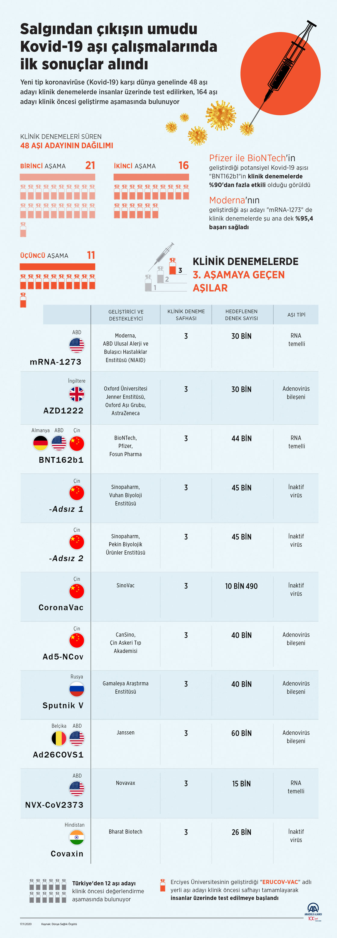 Yeni tip koronavirüse (Kovid-19) karşı dünya genelinde 48 aşı adayı klinik denemelerde insanlar üzerinde test edilirken, 164 aşı adayı klinik öncesi geliştirme aşamasında bulunuyor.