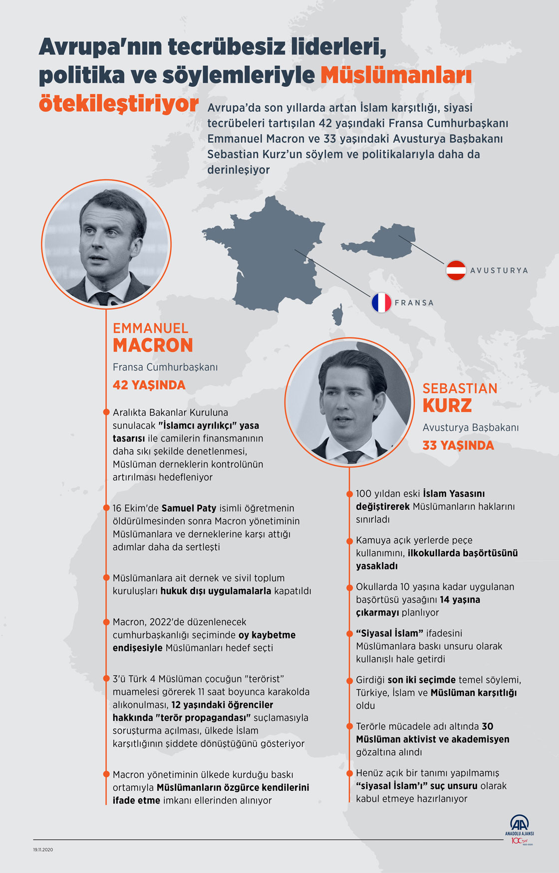 Avrupa'da son yıllarda artan İslam karşıtlığı, siyasi tecrübeleri tartışılan 42 yaşındaki Fransa Cumhurbaşkanı Emmanuel Macron ve 33 yaşındaki Avusturya Başbakanı Sebastian Kurz'un söylem ve politikalarıyla daha da derinleşiyor.19 Kasım 2020•Güncelleme: 19 Kasım 2020