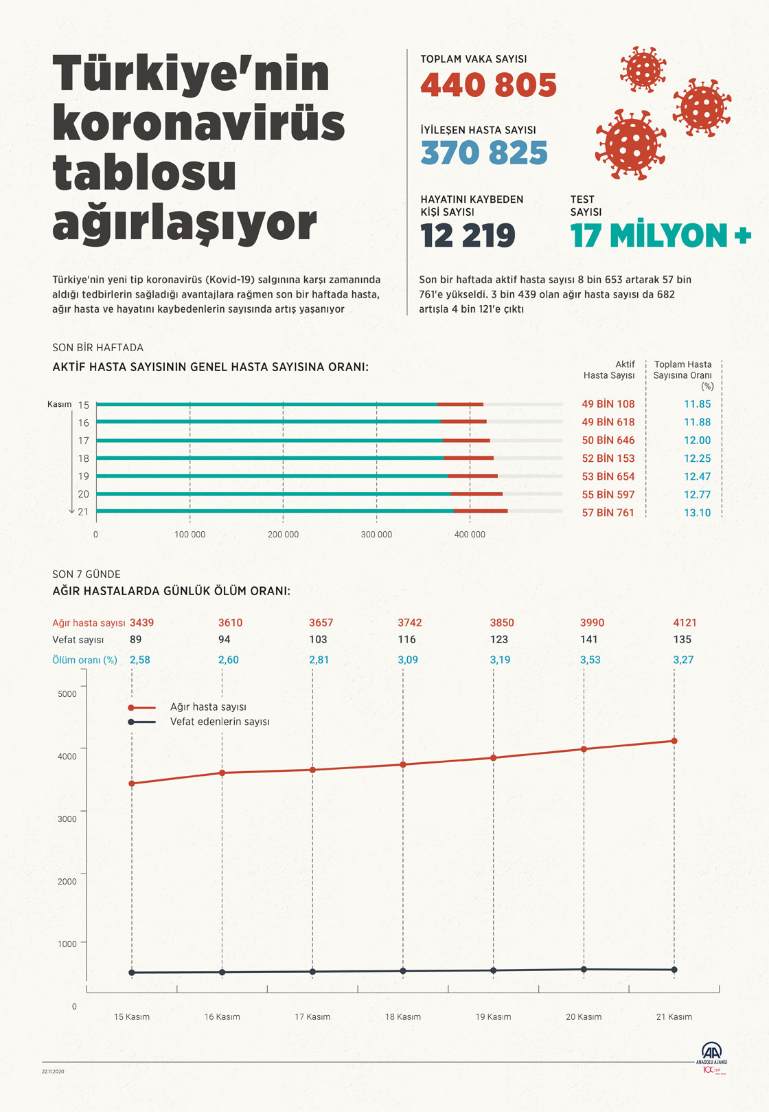 Türkiye'nin yeni tip koronavirüs (Kovid-19) salgınına karşı zamanında aldığı tedbirlerin sağladığı avantajlara rağmen son bir haftada hasta, ağır hasta ve hayatını kaybedenlerin sayısında artış yaşanıyor. ( Mahmut Resul Karaca- Anadolu Ajansı )