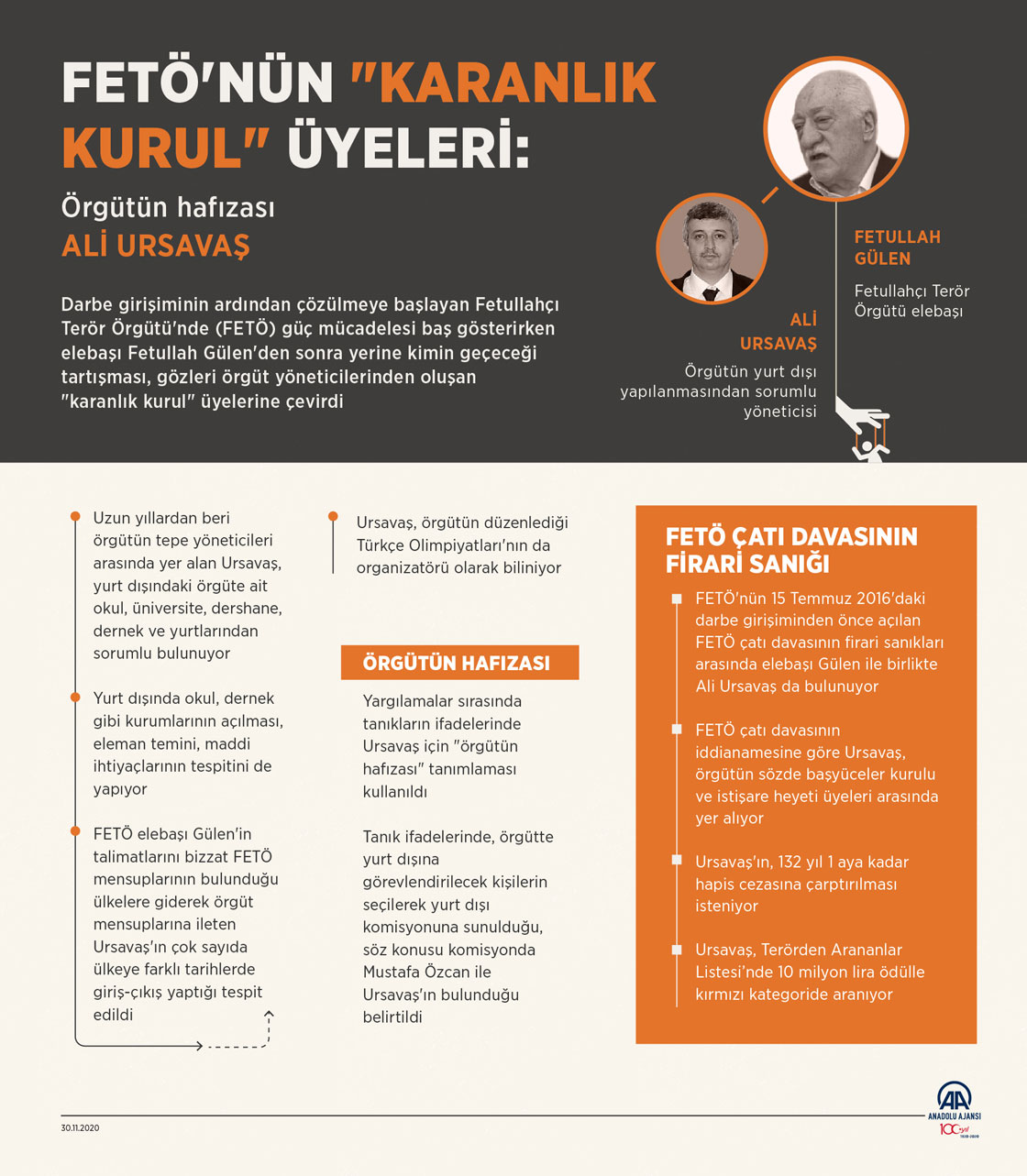 Darbe girişiminin ardından çözülmeye başlayan Fetullahçı Terör Örgütü'nde (FETÖ) güç mücadelesi baş gösterirken elebaşı Fetullah Gülen'den sonra yerine kimin geçeceği tartışması, gözleri örgüt yöneticilerinden oluşan "karanlık kurul" üyelerine çevirdi. ( Kemal Delikmen - Anadolu Ajansı ) 30 Kasım 2020•Güncelleme: 30 Kasım 2020