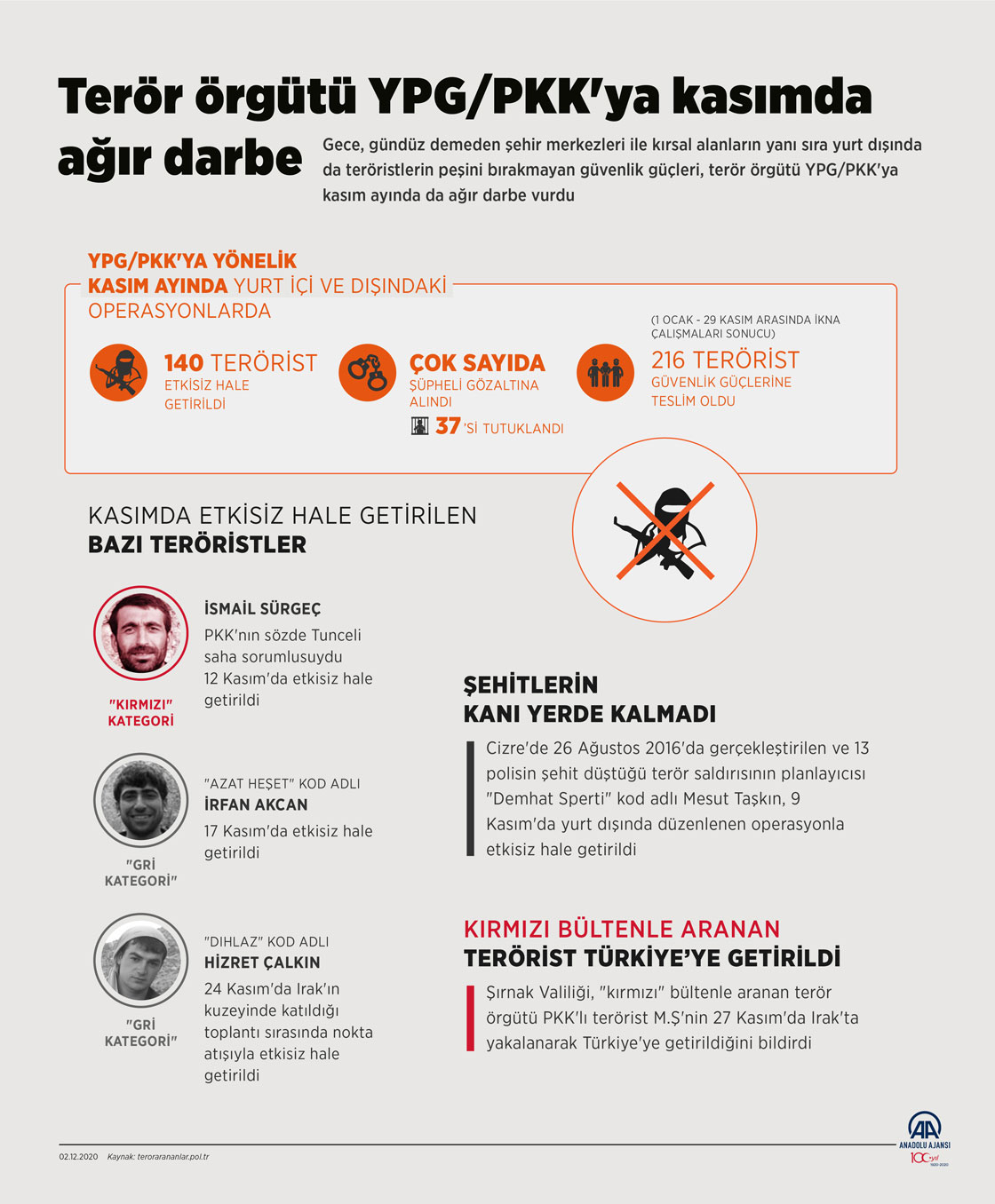 Gece, gündüz demeden şehir merkezleri ile kırsal alanların yanı sıra yurt dışında da teröristlerin peşini bırakmayan güvenlik güçleri, terör örgütü YPG/PKK'ya kasım ayında da ağır darbe vurdu. ( Muhammed Ali Yiğit - Anadolu Ajansı )