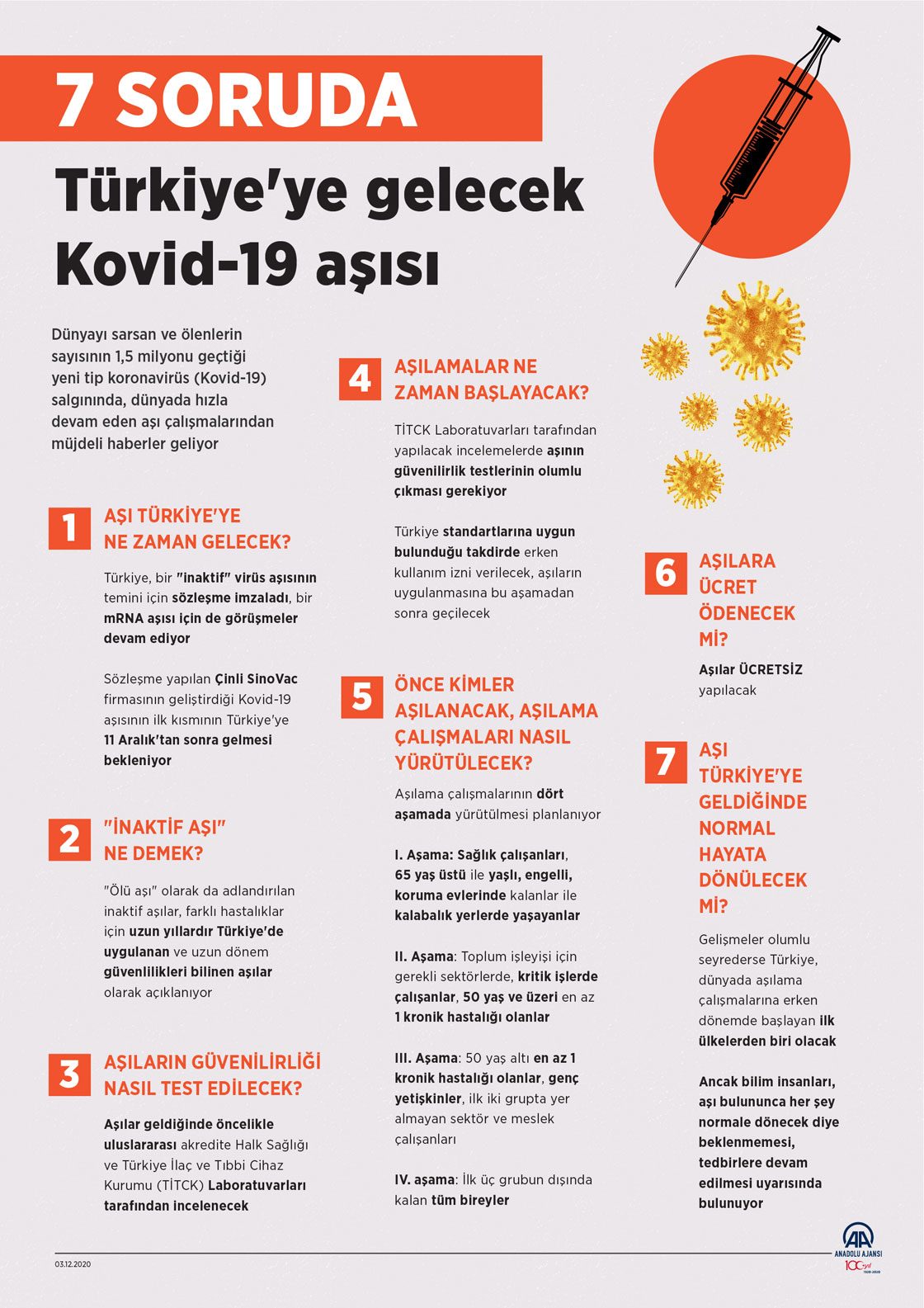 Dünyayı sarsan ve ölenlerin sayısının 1,5 milyonu geçtiği yeni tip koronavirüs (Kovid-19) salgınında, dünyada hızla devam eden aşı çalışmalarından müjdeli haberler geliyor. ( Mahmut Resul Karaca - Anadolu Ajansı )