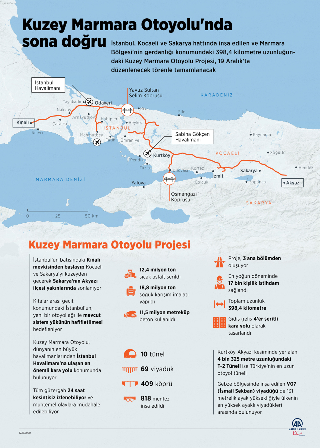 İstanbul'un çevre illere ve diğer bölgelere ulaşımını büyük oranda kolaylaştıracak Kuzey Marmara Otoyolu'nun son kesimi olan İzmit-Akyazı bölümü, 19 Aralık'ta açılacak. Toplam uzunluğu 398,4 kilometreyi bulan projede 12,4 milyon tonu sıcak asfalt olmak üzere 31,2 milyon ton üst yapı imalatı gerçekleştirildi, 11,5 milyon metreküp beton kullanıldı. Otoyolda toplam 35 kilometre uzunluğa ulaşan 10 tünel, 56 kilometreyi bulan 69 viyadük, 409 köprü ve 818 menfez yer alıyor. (Grafik: Elmurod Usubaliev/AA)