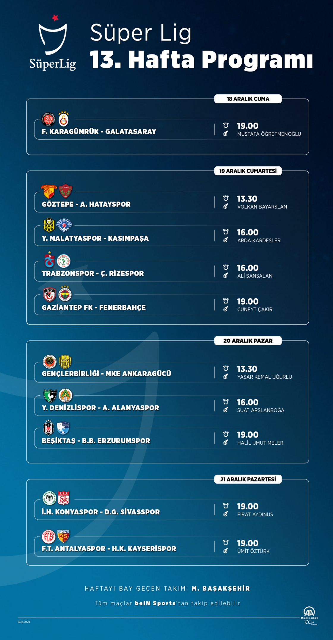 Süper Lig'in 13. haftası 18 Aralık Cuma günü Fatih Karagümrük ve Galatasaray arasında oynanacak maç ile başlayacak. 19 Aralık Cumartesi günü 4, 20 Aralık Pazar günü 3 ve 21 Aralık Pazartesi günü ise 2 maç oynanacak. Haftayı maç oynamadan geçecek takım ise Medipol Başakşehir olacak. (Anadolu Ajansı - Kemal Delikmen)18 Aralık 2020•Güncelleme: 18 Aralık 2020