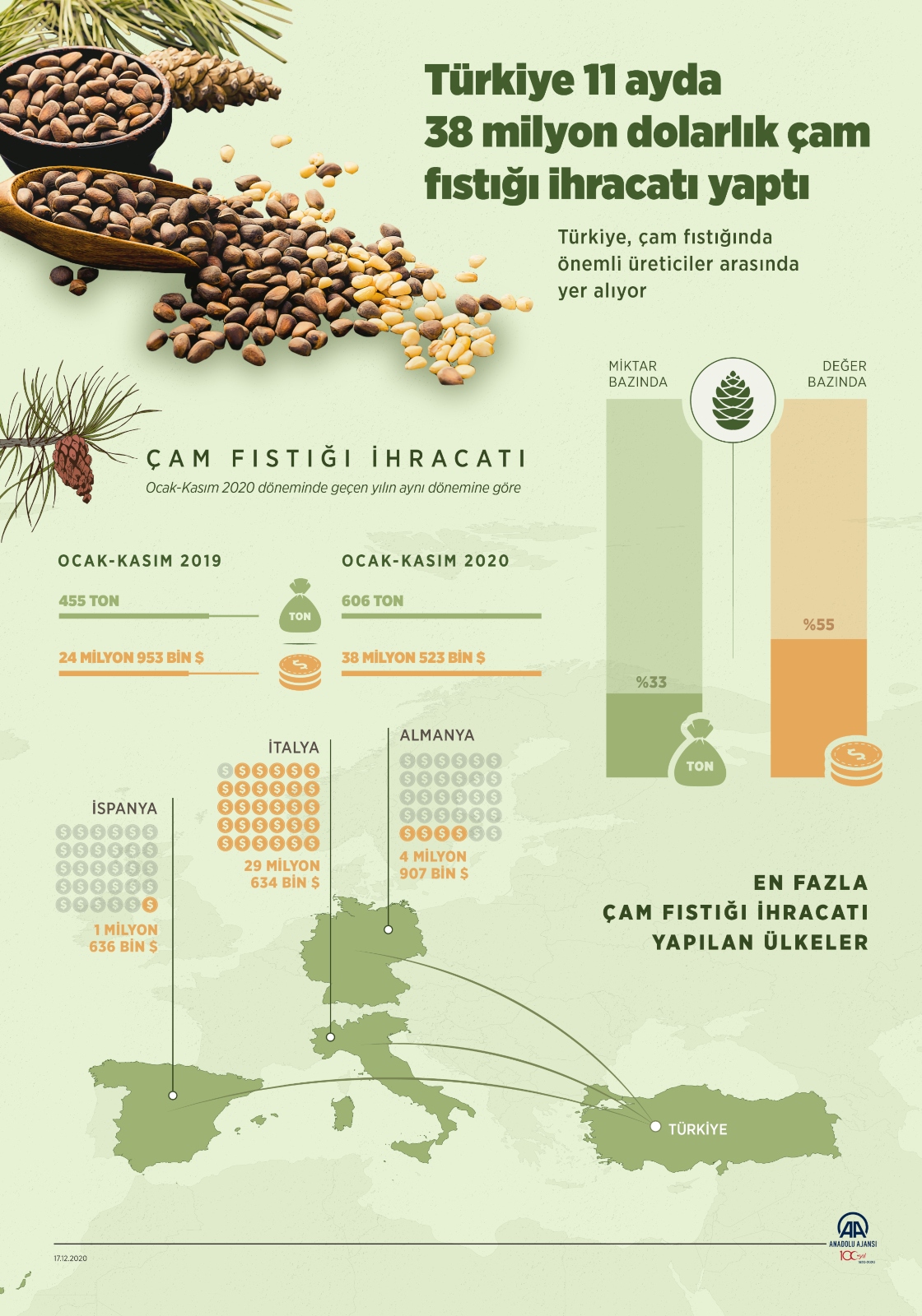Türkiye'nin 2018'de çam fıstığı ihracatı 26 milyon 511 bin dolar olarak kayıtlara geçti. 2019'da ise çam fıstığı ihracatı 28 milyon 739 milyon dolara yükseldi. (Anadolu Ajansı - Muhammed Ali Yiğit)