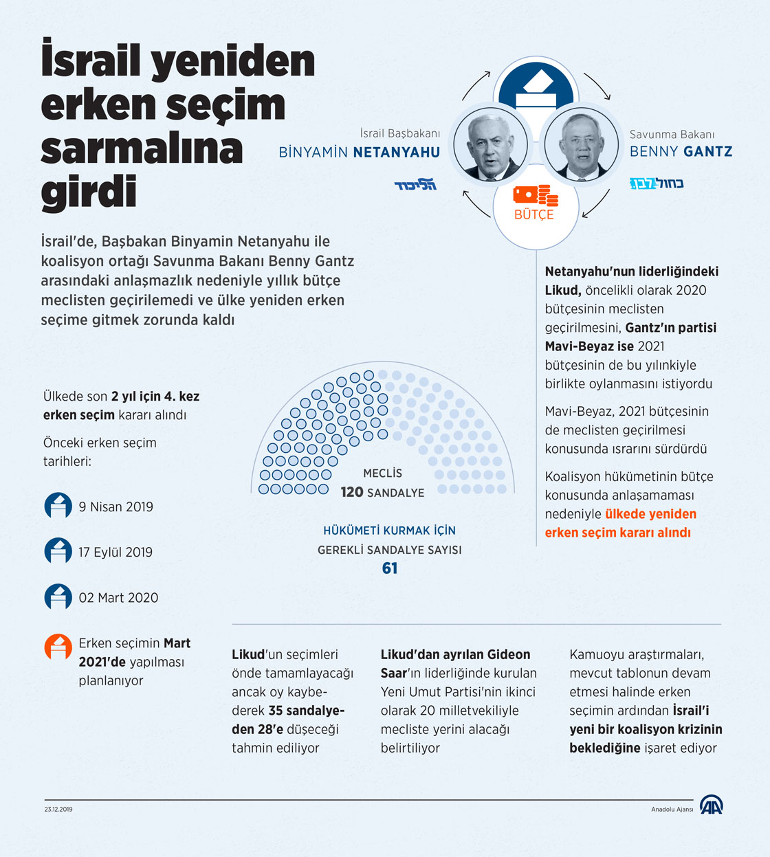 İsrail'de, Başbakan Binyamin Netanyahu ile koalisyon ortağı Savunma Bakanı Benny Gantz arasındaki anlaşmazlık nedeniyle yıllık bütçe meclisten geçirilemedi ve ülke yeniden erken seçime gitmek zorunda kaldı. ( Elmurod Usubaliev - Anadolu Ajansı )