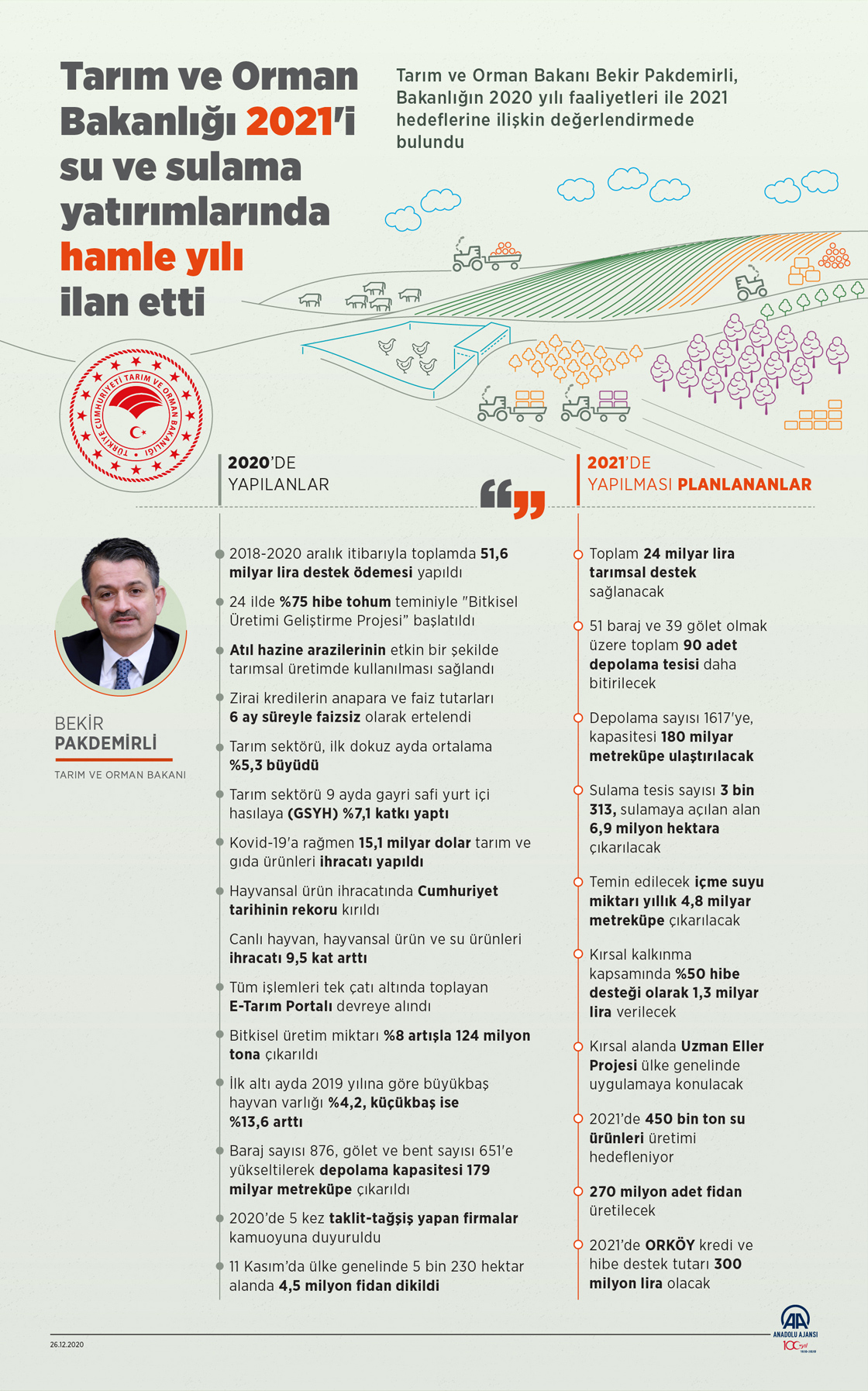 Tarım ve Orman Bakanı Bekir Pakdemirli, Bakanlığın 2020 yılı faaliyetleri ile 2021 hedeflerine ilişkin değerlendirmede bulundu. (Grafik: Elmurod Usubaliev/AA)