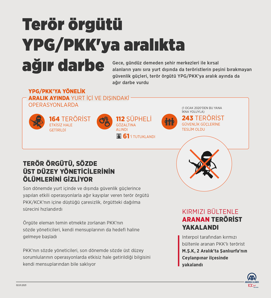 Gece, gündüz demeden şehir merkezleri ile kırsal alanların yanı sıra yurt dışında da teröristlerin peşini bırakmayan güvenlik güçleri, terör örgütü YPG/PKK'ya aralık ayında da ağır darbe vurdu. (Grafik: Yasin Demirci/AA)