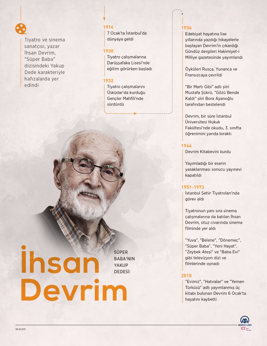 Tiyatro ve sinema sanatçısı, yazar İhsan Devrim "Süper Baba" dizisinde canlandırdığı "Yakup Dede" karakteriyle hafızalarda yer edindi. (Anadolu Ajansı - Kemal Delikmen)