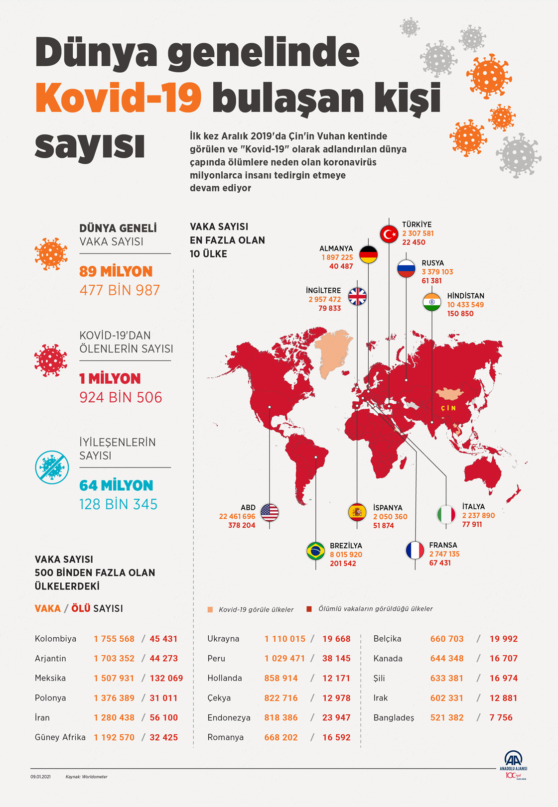 Dünya genelinde yeni tip koronavirüs (Kovid-19) salgınında toplam vaka sayısı 89 milyon 361 bini geçti. (Grafik: Ahmet Burak Özkan)