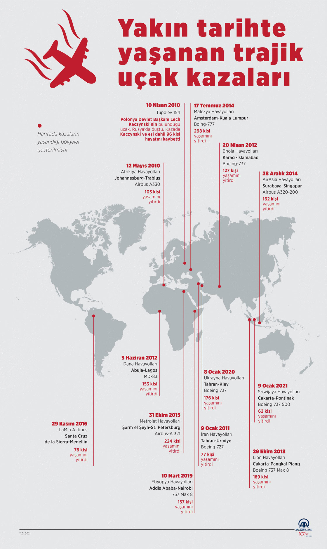 Endonezya'da Cakarta-Pontinak seferini yapmak üzere havalandıktan 4 dakika sonra Cakarta sahilinin kuzeyindeki Thousand Adaları açıklarında düşen Boeing 737 500 tipi yolcu uçağında, 12 kişilik kabin ekibiyle aralarında bebek ve çocukların bulunduğu 62 kişi yaşamını yitirdi. ( Mahmut Resul Karaca - Anadolu Ajansı )