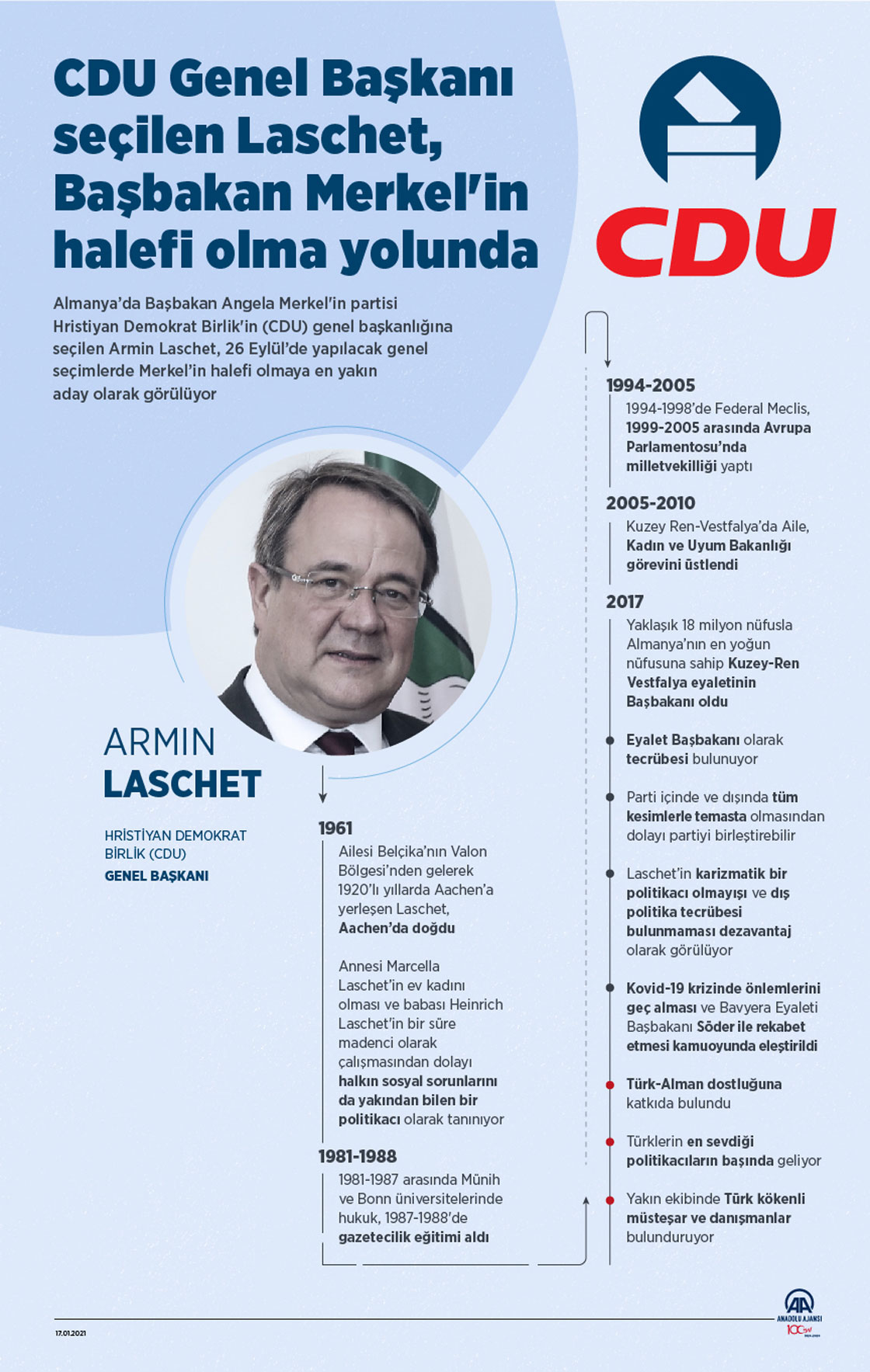 Almanya’da Başbakan Angela Merkel'in partisi Hristiyan Demokrat Birlik'in (CDU) genel başkanlığına seçilen Armin Laschet, 26 Eylül’de yapılacak genel seçimlerde Merkel’in halefi olmaya en yakın aday olarak görülüyor. ( Mahmut Resul Karaca - Anadolu Ajansı )