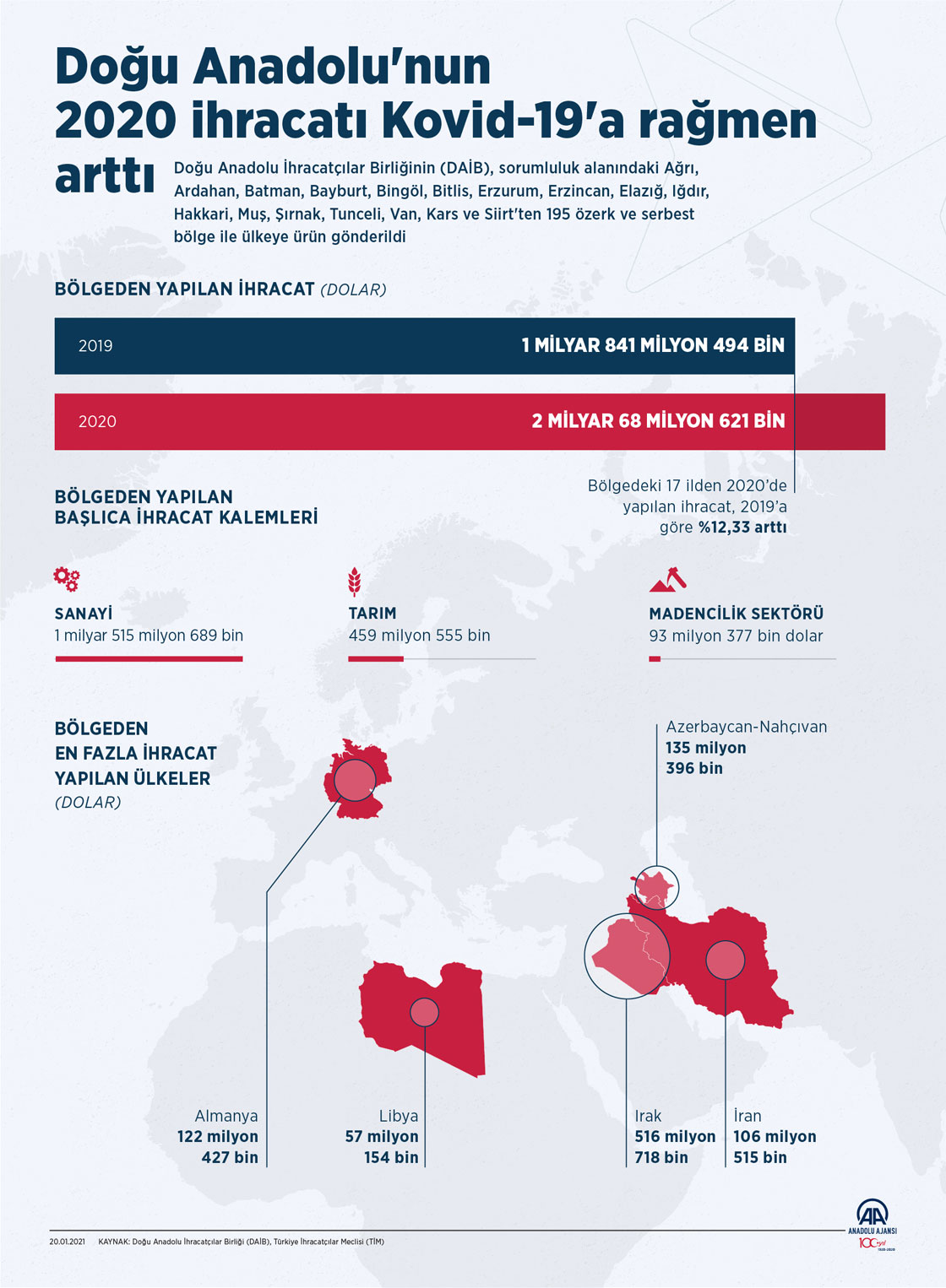 Doğu Anadolu İhracatçılar Birliğinin (DAİB), sorumluluk alanındaki Ağrı, Ardahan, Batman, Bayburt, Bingöl, Bitlis, Erzurum, Erzincan, Elazığ, Iğdır, Hakkari, Muş, Şırnak, Tunceli, Van, Kars ve Siirt'ten 195 özerk ve serbest bölge ile ülkeye ürün gönderildi. Birliğin sorumluluk alanındaki 17 ilden geçen yıl yapılan ihracat, 2019 yılına göre yüzde 12,33'lük artışla 2 milyar 68 milyon 621 bin dolara ulaştı. Birlik üyelerinin 12 ayda en çok dış satım yaptığı ülke Irak oldu. ( Ahmet Burak Özkan - Anadolu Ajansı )