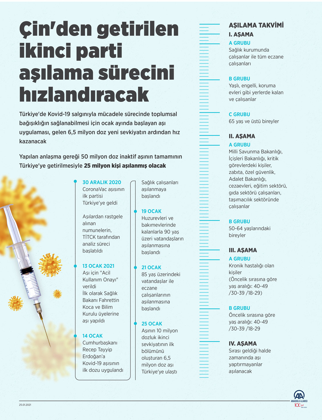 Türkiye'de yeni tip koronavirüs (Kovid-19) salgınıyla mücadele sürecinde toplumsal bağışıklığın sağlanabilmesi için ocak ayında başlayan aşı uygulaması, bugün gelen 6,5 milyon doz yeni sevkiyatın ardından hız kazanacak.( Mahmut Resul Karaca - Anadolu Ajansı )