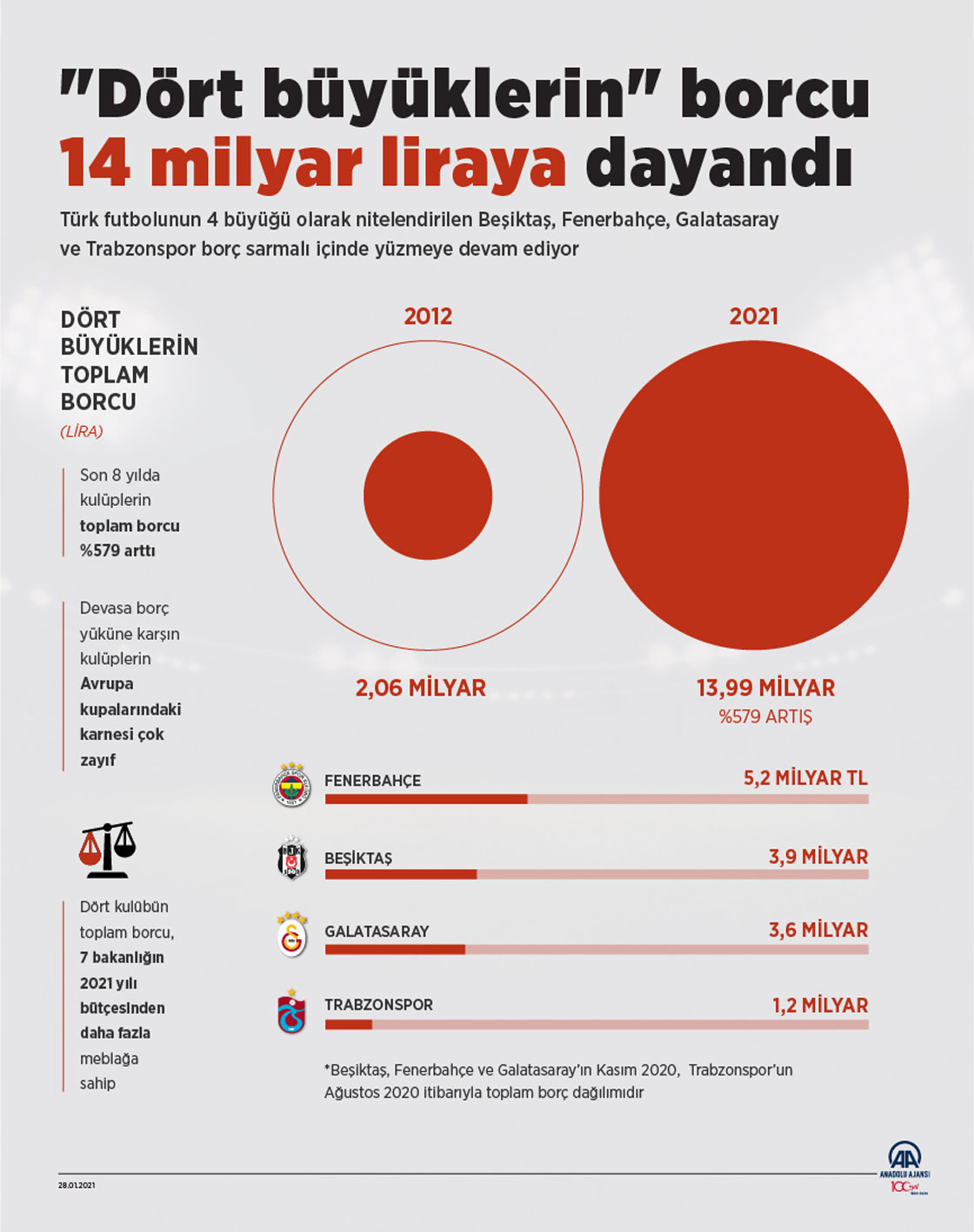 Türk futbolunun 4 büyüğü olarak nitelendirilen Beşiktaş, Fenerbahçe, Galatasaray ve Trabzonspor borç sarmalı içinde yüzmeye devam ediyor. ( Mahmut Resul Karaca - Anadolu Ajansı )