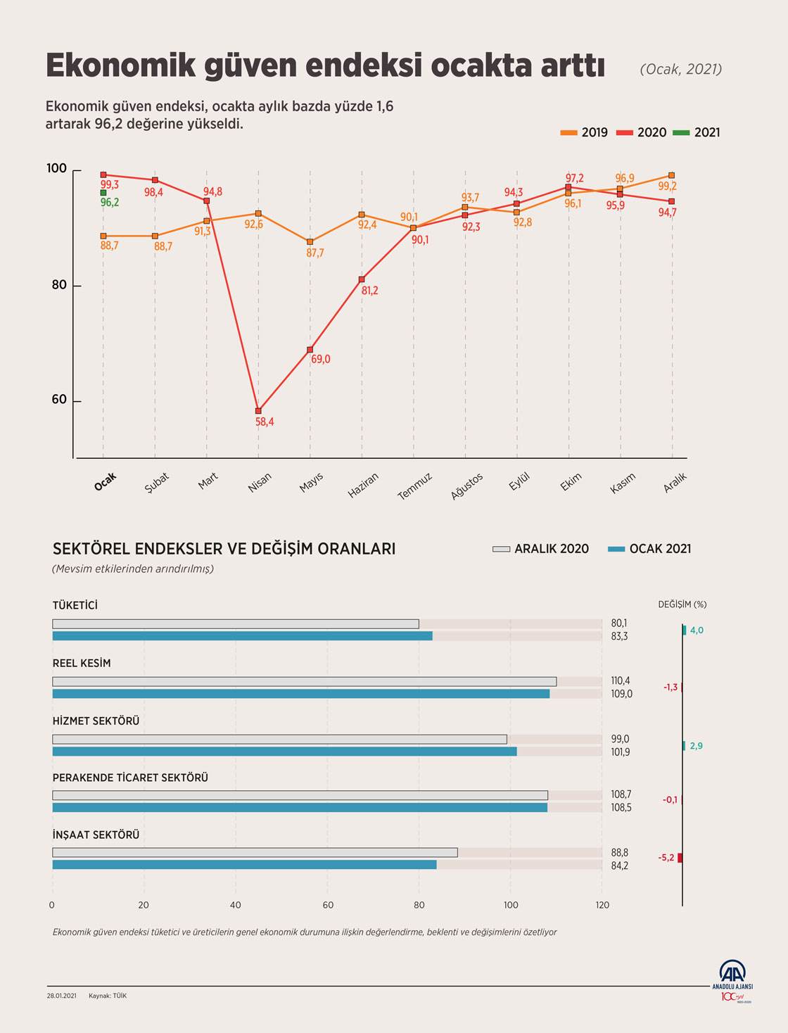 Ekonomik güven endeksi, ocakta aylık bazda yüzde 1,6 artarak 96,2 değerine yükseldi. ( Yılmaz Yücel - Anadolu Ajansı )