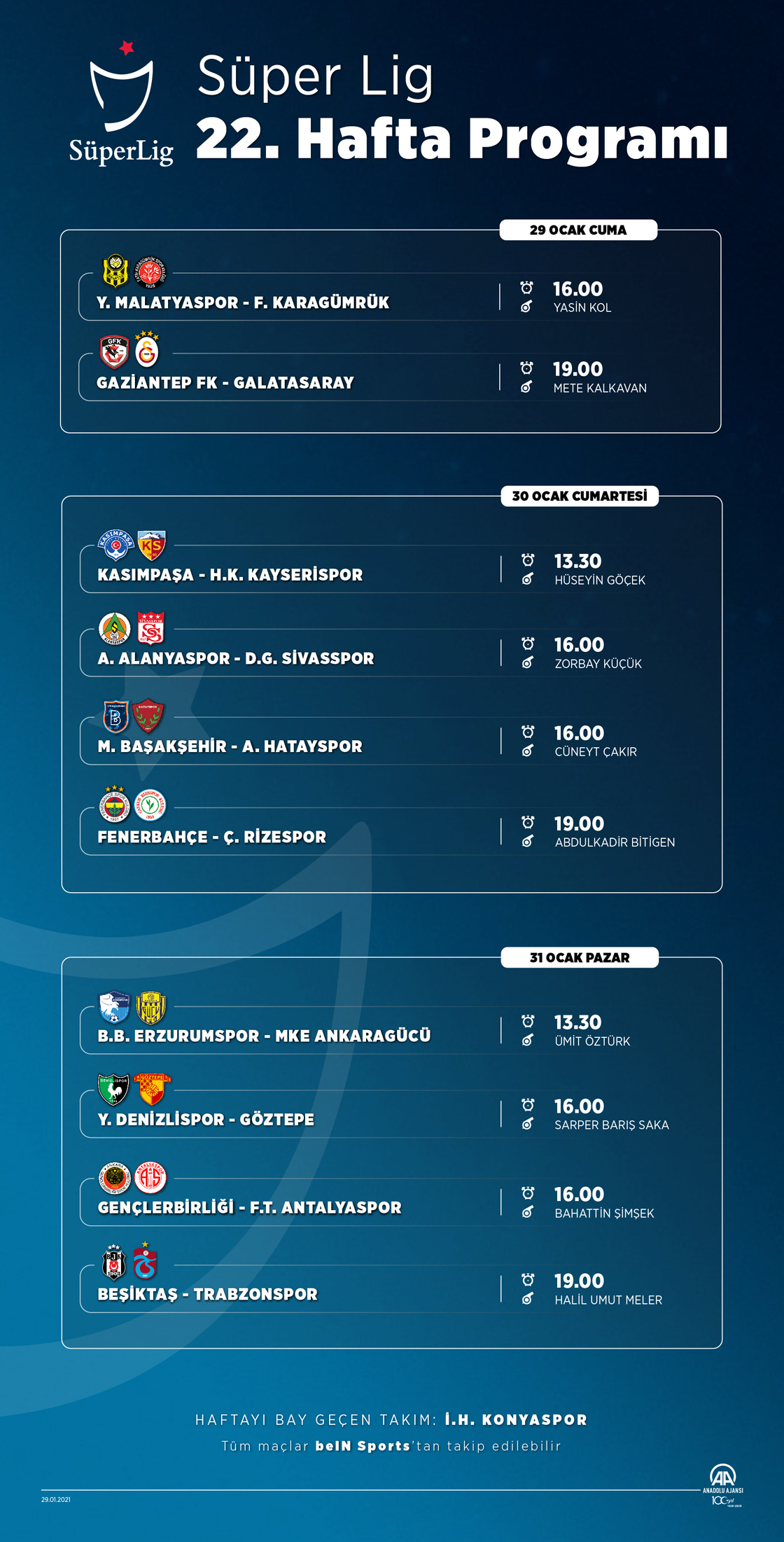 Süper Lig'in 22. haftası 29 Ocak Cuma günü 2 maç ile başlayacak. 30 Ocak Cumartesi ve 31 Ocak Pazar günü 4'er maç oynanacak. Haftayı maç oynamadan geçecek takım ise İttifak Holding Konyaspor olacak. ( Kemal Delikmen - Anadolu Ajansı )