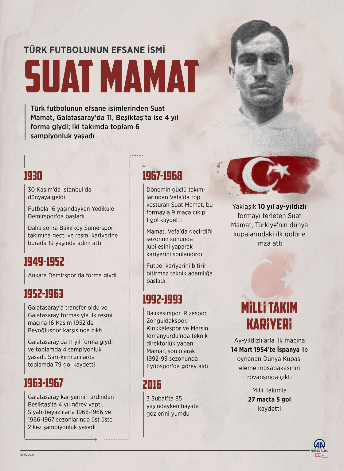 Türk futbolunun efsane isimlerinden Suat Mamat, Galatasaray'da 11, Beşiktaş'ta ise 4 yıl forma giydi; iki takımda toplam 6 şampiyonluk yaşadı. ( Elmurod Usubaliev - Anadolu Ajansı )