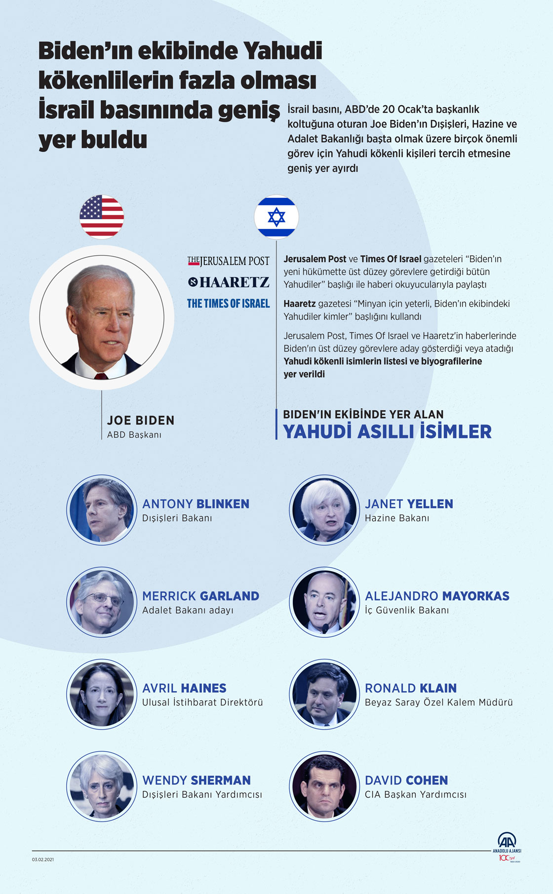 İsrail basını, ABD’de 20 Ocak’ta başkanlık koltuğuna oturan Joe Biden’ın Dışişleri, Hazine ve Adalet Bakanlığı başta olmak üzere birçok önemli görev için Yahudi kökenli isimleri tercih etmesine geniş yer ayırdı. ( Elmurod Usubaliev - Anadolu Ajansı )