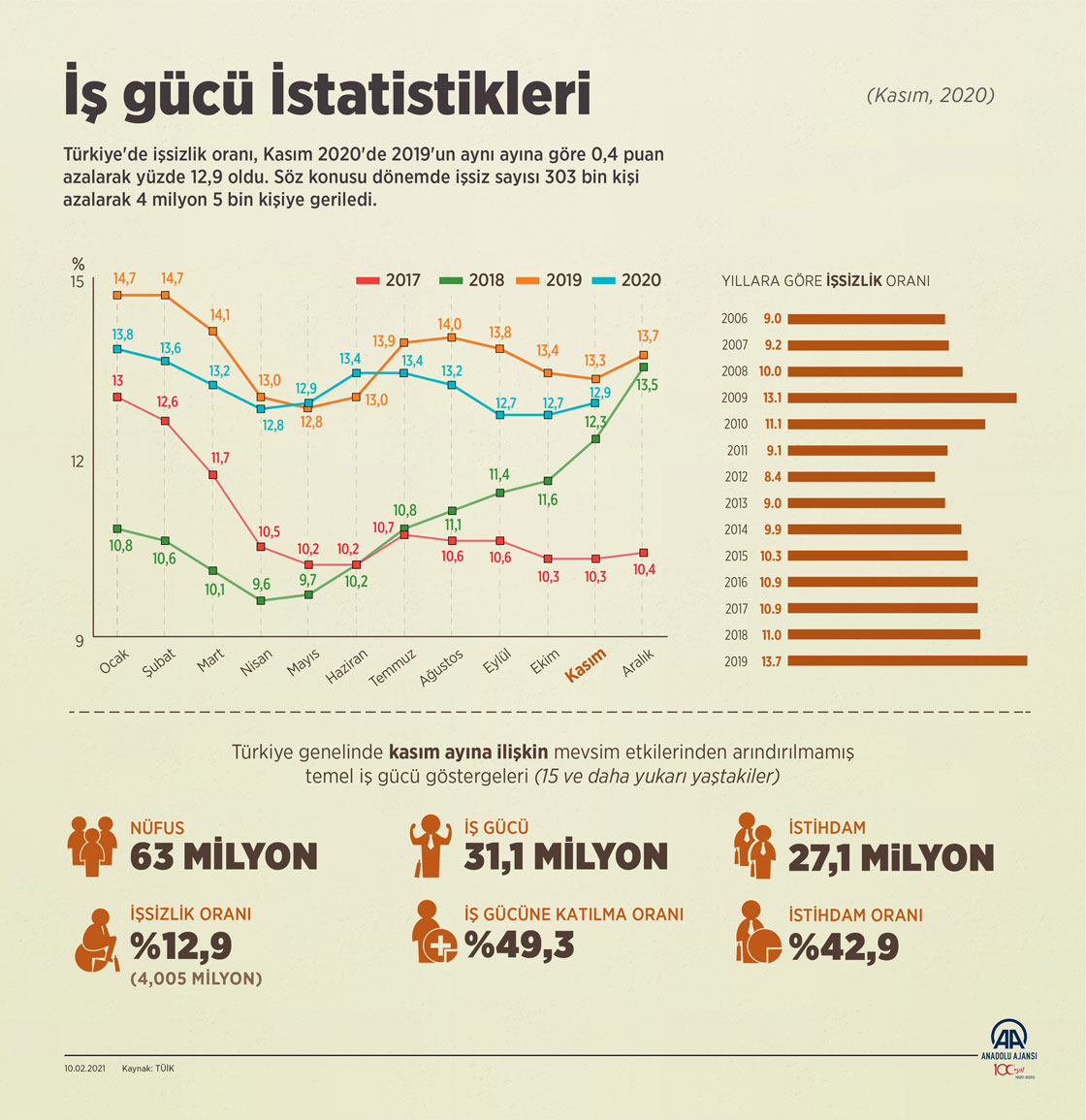 Türkiye'de işsizlik oranı, Kasım 2020'de 2019'un aynı ayına göre 0,4 puan azalarak yüzde 12,9 oldu. Söz konusu dönemde işsiz sayısı 303 bin kişi azalarak 4 milyon 5 bin kişiye geriledi. ( Yılmaz Yücel - Anadolu Ajansı )
