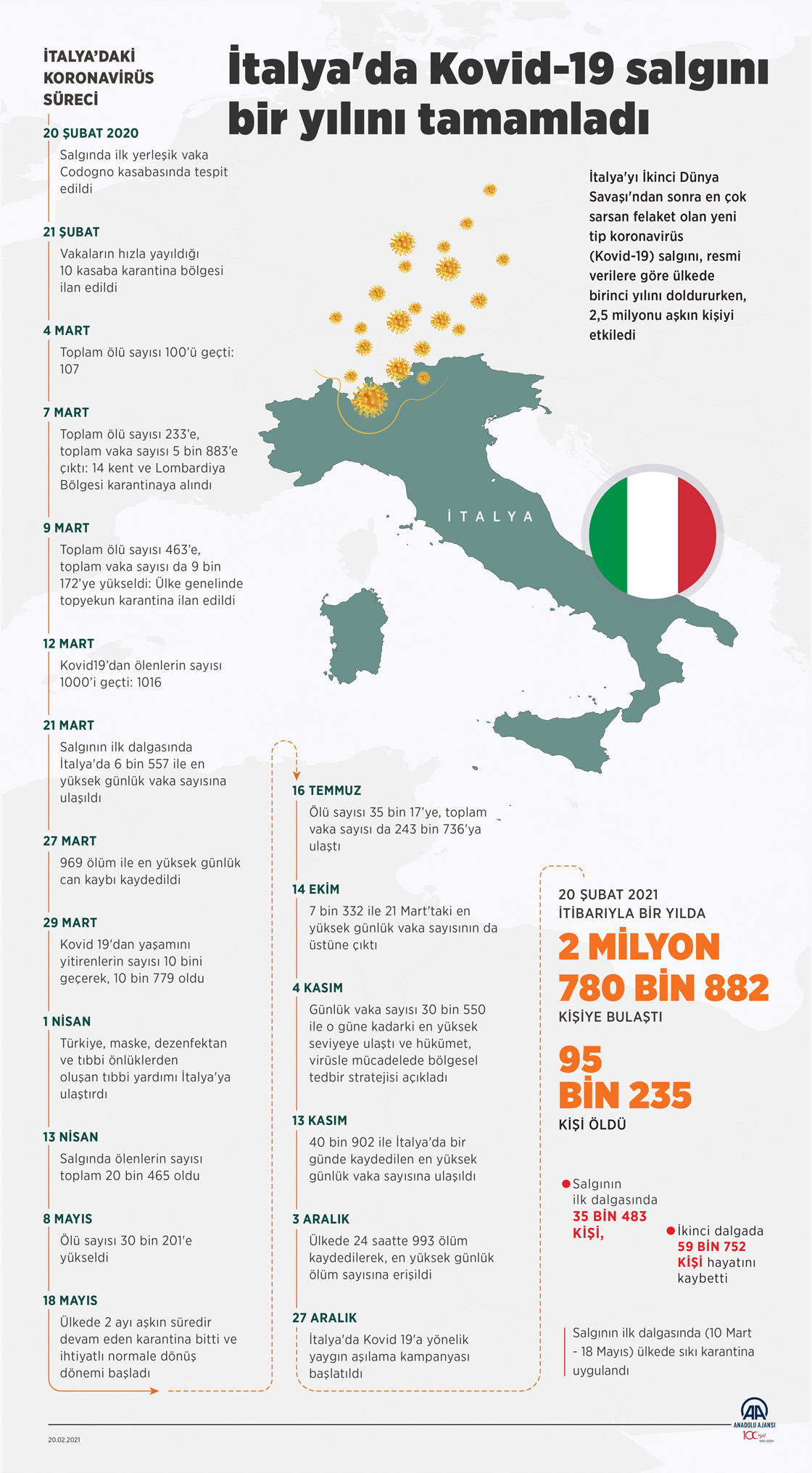İtalya'yı İkinci Dünya Savaşı'ndan sonra en çok sarsan felaket olan yeni tip koronavirüs (Kovid-19) salgını, resmi verilere göre ülkede birinci yılını doldururken, 2,5 milyonu aşkın kişiyi etkiledi. (Grafik:Yasin Demirci/AA)