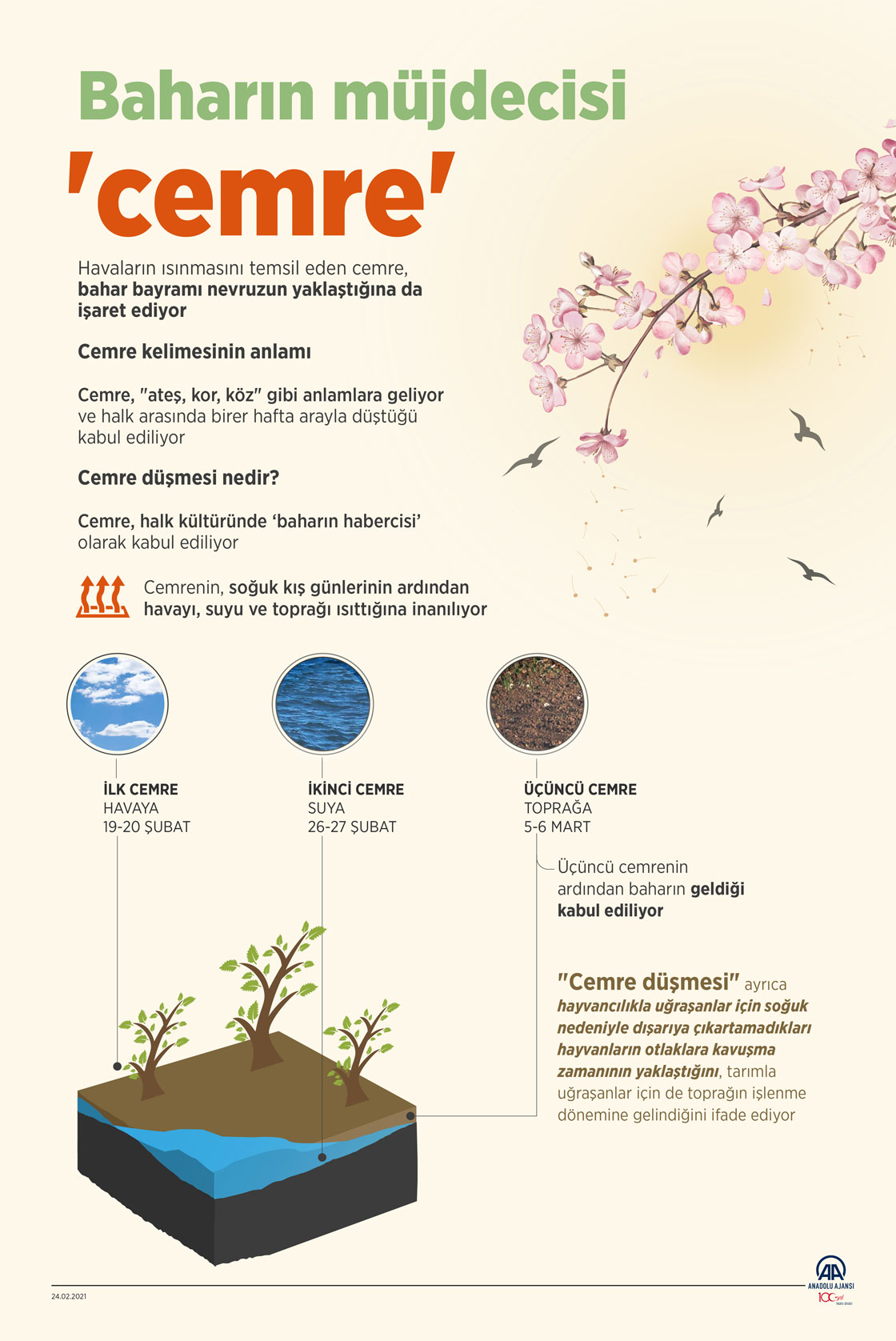 "Ateş, kor, köz" gibi anlamları olan ve halk arasında birer hafta arayla düştüğü kabul edilen cemrenin, soğuk kış günlerinin ardından havayı, suyu ve toprağı ısıttığına inanılıyor. ( Omar Zaghloul - Anadolu Ajansı )