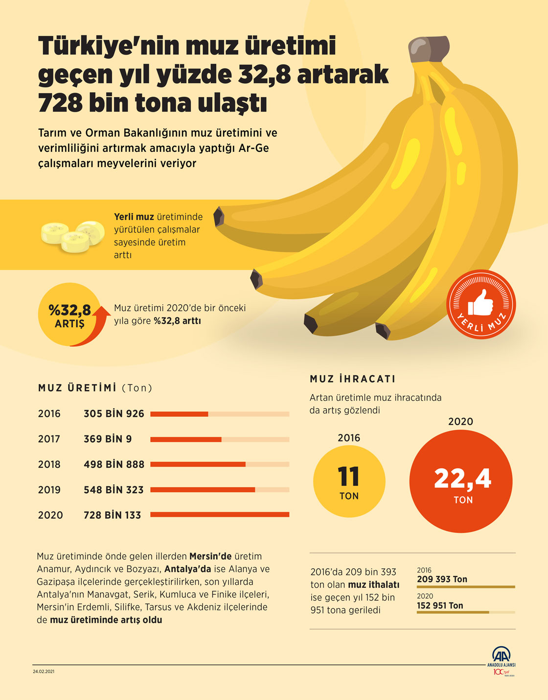 Türkiye'nin muz üretimi geçen yıl yüzde 32,8 artarak 728 bin tona ulaştı
