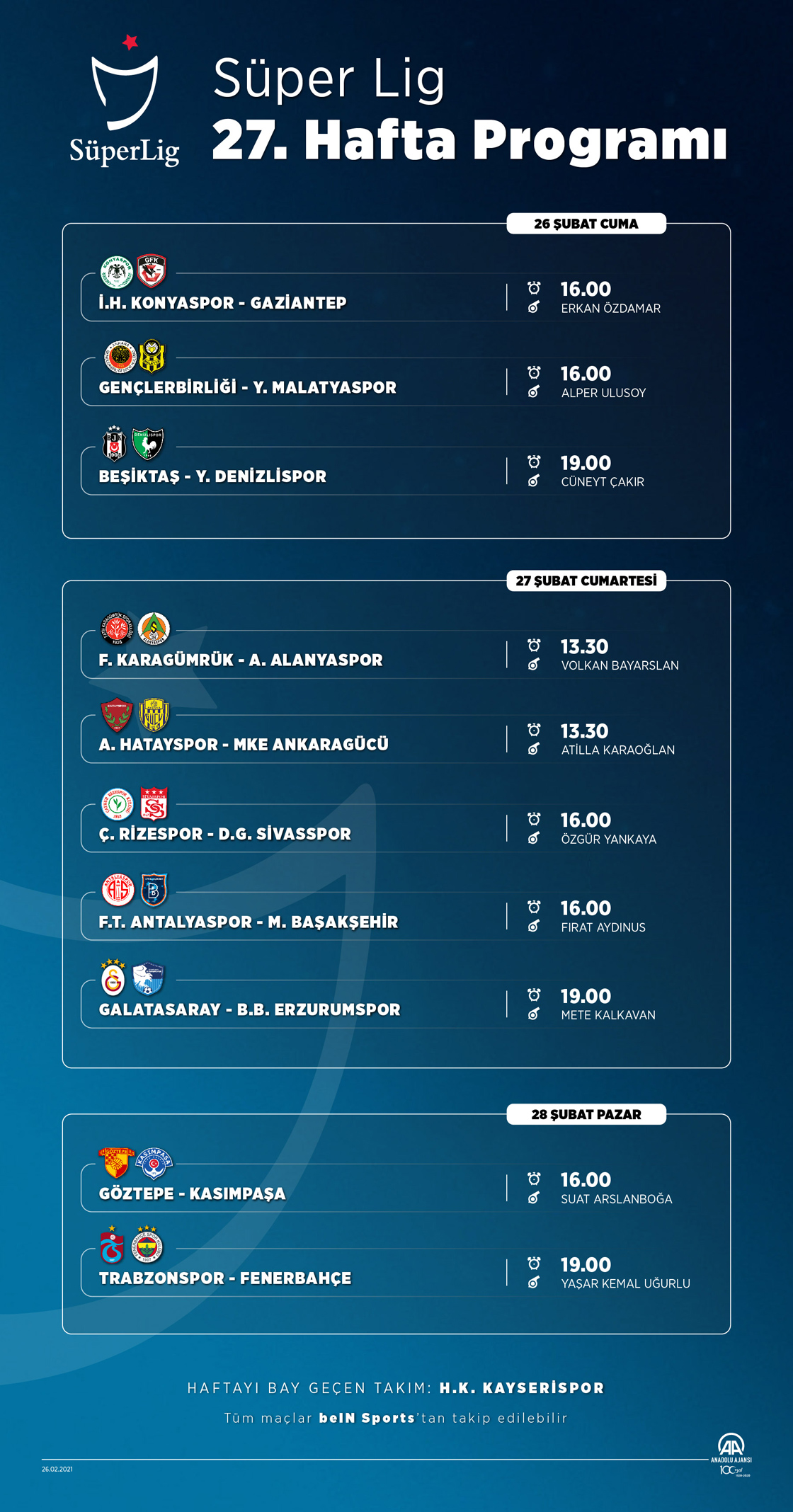 Süper Lig'in 27. haftası 26 Şubat Cuma günü 3 maç ile başlayacak. 27 Şubat Cumartesi günü 5 ve 28 Şubat Pazar günü ise 2 maç oynanacak. Haftayı maç oynamadan geçecek takım ise Hes Kablo Kayserispor olacak.
