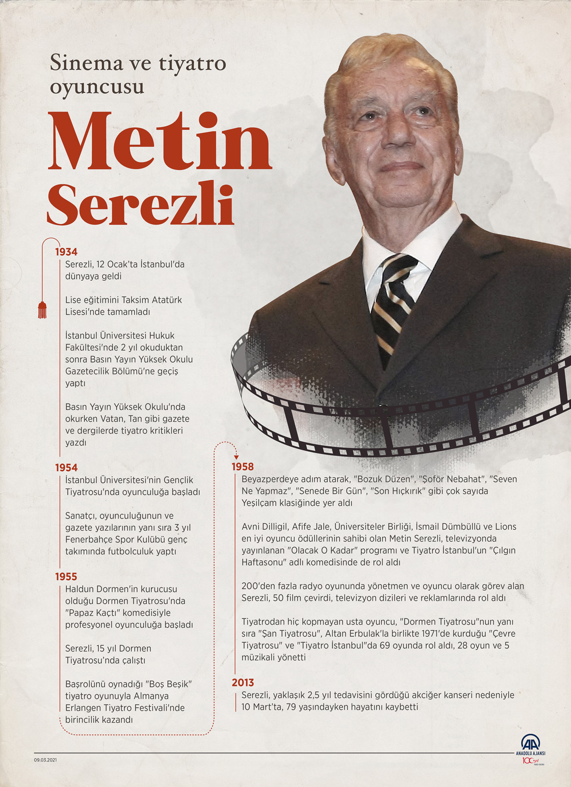 Sanat hayatı boyunca 200'den fazla radyo oyununda yönetmen ve oyuncu olarak görev yapan Serezli, 50 film çevirdi, televizyon dizileri, reklamlar ve tiyatro oyunlarında rol aldı. (Grafik: Omar Zaghloul/AA)