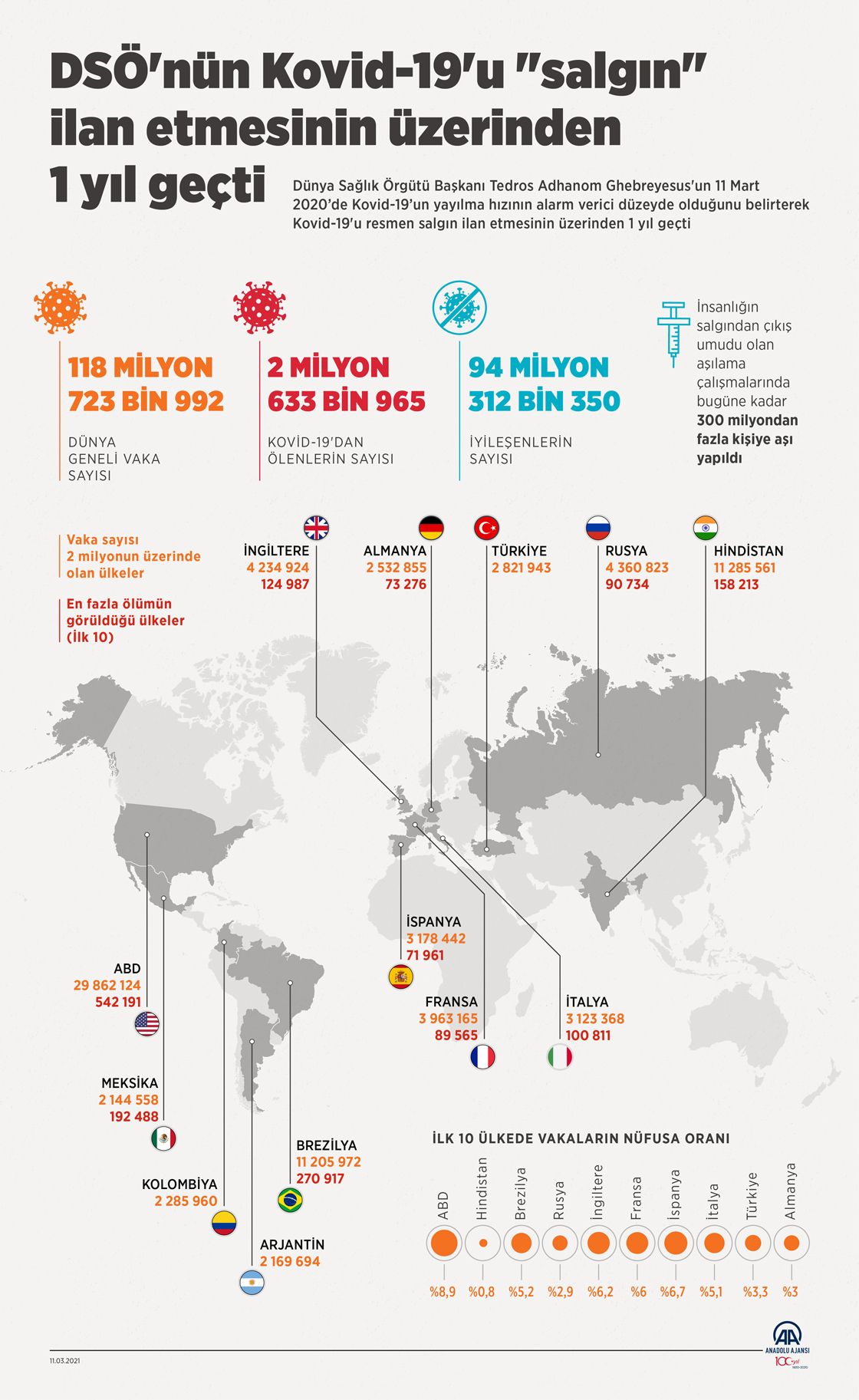 Çin'in Vuhan kentinde ortaya çıkışının ardından hızla dünya geneline yayılarak insanları evlerine kapatan, ekonomileri vuran ve bugüne kadar 2 milyon 633 bini aşkın kişinin hayatını kaybetmesine neden olan yeni tip koronavirüsün (Kovid-19) küresel "salgın" ilan edilmesinin üzerinden 1 yıl geçti. (Grafik: Yasin Demirci / AA)11 Mart 2021•Güncelleme: 11 Mart 2021