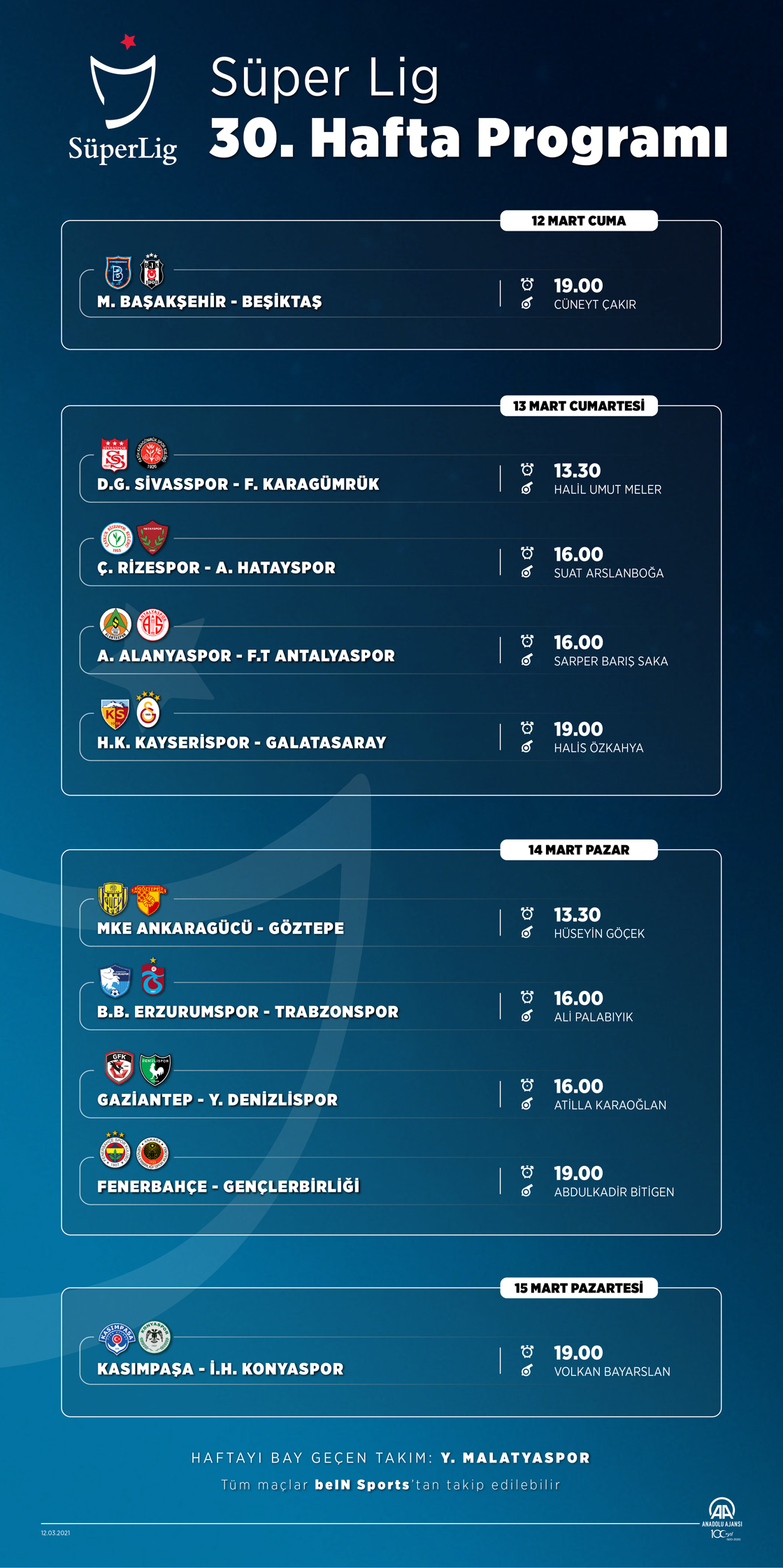 Süper Lig'in 30. haftası 12 Mart Cuma günü 1 maç ile başlayacak. 13 Mart Cumartesi ve 14 Mart Pazar günü 4'er maç oynanacak. 15 Mart Pazartesi günü ise 1 maç oynanacak. Haftayı maç oynamadan geçecek takım Yeni Malatyaspor olacak.