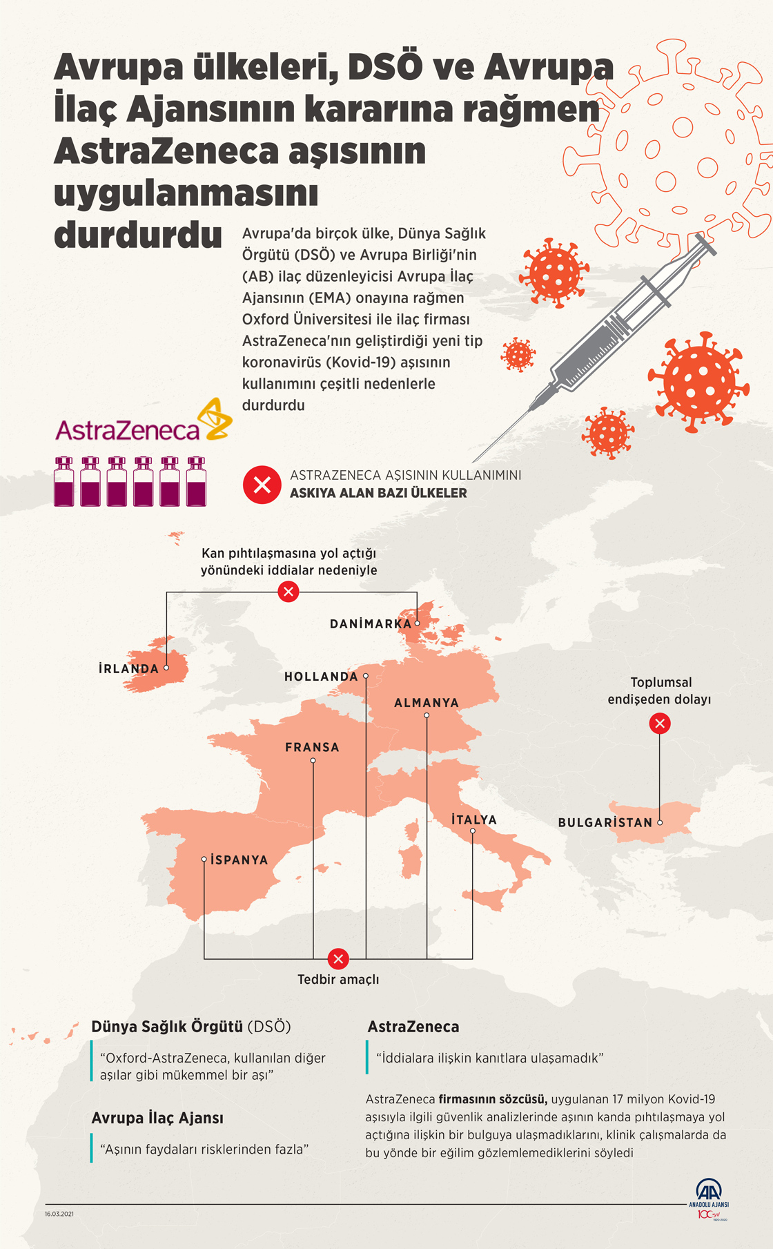 Avrupa'da birçok ülke, Dünya Sağlık Örgütü (DSÖ) ve Avrupa Birliği'nin (AB) ilaç düzenleyicisi Avrupa İlaç Ajansının (EMA) onayına rağmen Oxford Üniversitesi ile ilaç firması AstraZeneca'nın geliştirdiği yeni tip koronavirüs (Kovid-19) aşısının kullanımını çeşitli nedenlerle durdurdu.(Grafik: Elmurod Usubaliev/AA)