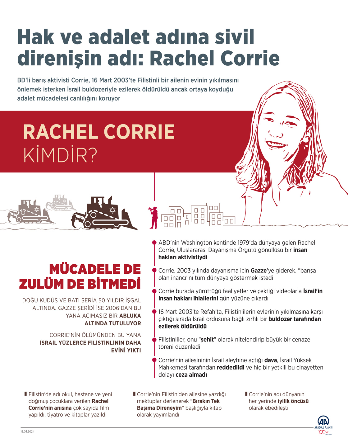 ABD'li barış aktivisti Corrie, bundan tam 18 yıl önce bugün Filistinli bir ailenin evinin yıkılmasını önlemek isterken İsrail buldozeriyle ezilerek öldürüldü ancak ortaya koyduğu adalet mücadelesi canlılığını koruyor.