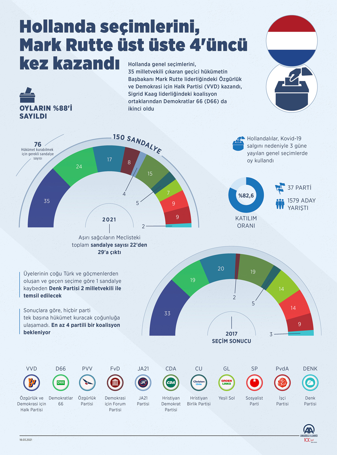 Hollanda genel seçimlerini, 35 milletvekili çıkaran geçici hükümetin Başbakanı Mark Rutte liderliğindeki Özgürlük ve Demokrasi için Halk Partisi (VVD) kazandı, kadın siyasetçi Sigrid Kaag liderliğindeki koalisyon ortaklarından Demokratlar 66 (D66) da ikinci oldu. (Grafik: Yasin Demirci/AA)
