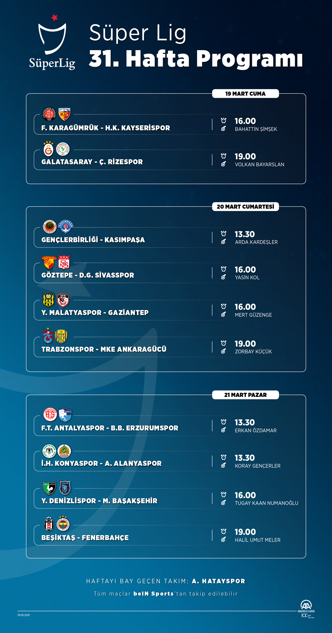 Süper Lig'in 31. haftası 19 Mart Cuma günü 2 maç ile başlayacak. 20 Mart Cumartesi ve 21 Mart Pazar günü 4'er maç oynanacak. Haftayı maç oynamadan geçecek takım ise Atakaş Hatayspor olacak. (Grafik: Kemal Delikmen)