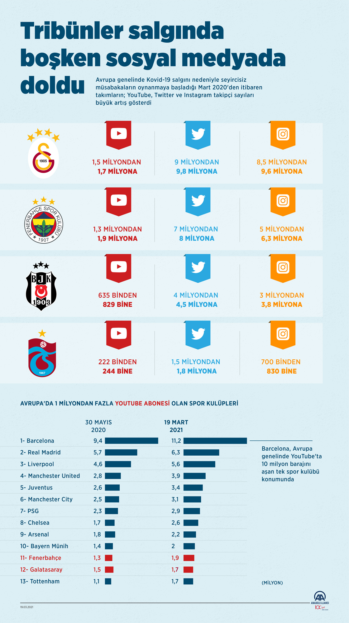 Avrupa genelindeki spor karşılaşmalarında tribünlerin boş kaldığı yeni tip koronavirüs (Kovid-19) salgını sürecinde sosyal medya, takımların yeni tribününe dönüşürken, taraftarlar takımlarını sosyal medyadan takip etti, izledi ve yorumladı. (Grafik: Yasin Demirci / AA)19 Mart 2021•Güncelleme: 19 Mart 2021