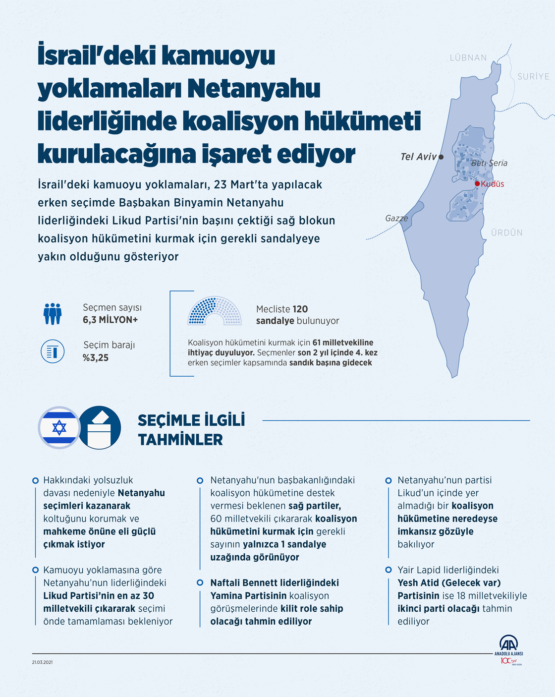 İsrail'deki kamuoyu yoklamaları, 23 Mart'ta yapılacak erken seçimde Başbakan Binyamin Netanyahu liderliğindeki Likud Partisi'nin başını çektiği sağ blokun koalisyon hükümetini kurmak için gerekli sandalyeye yakın olduğunu gösteriyor. ( Mahmut Resul Karaca - Anadolu Ajansı )21 Mart 2021•Güncelleme: 21 Mart 2021