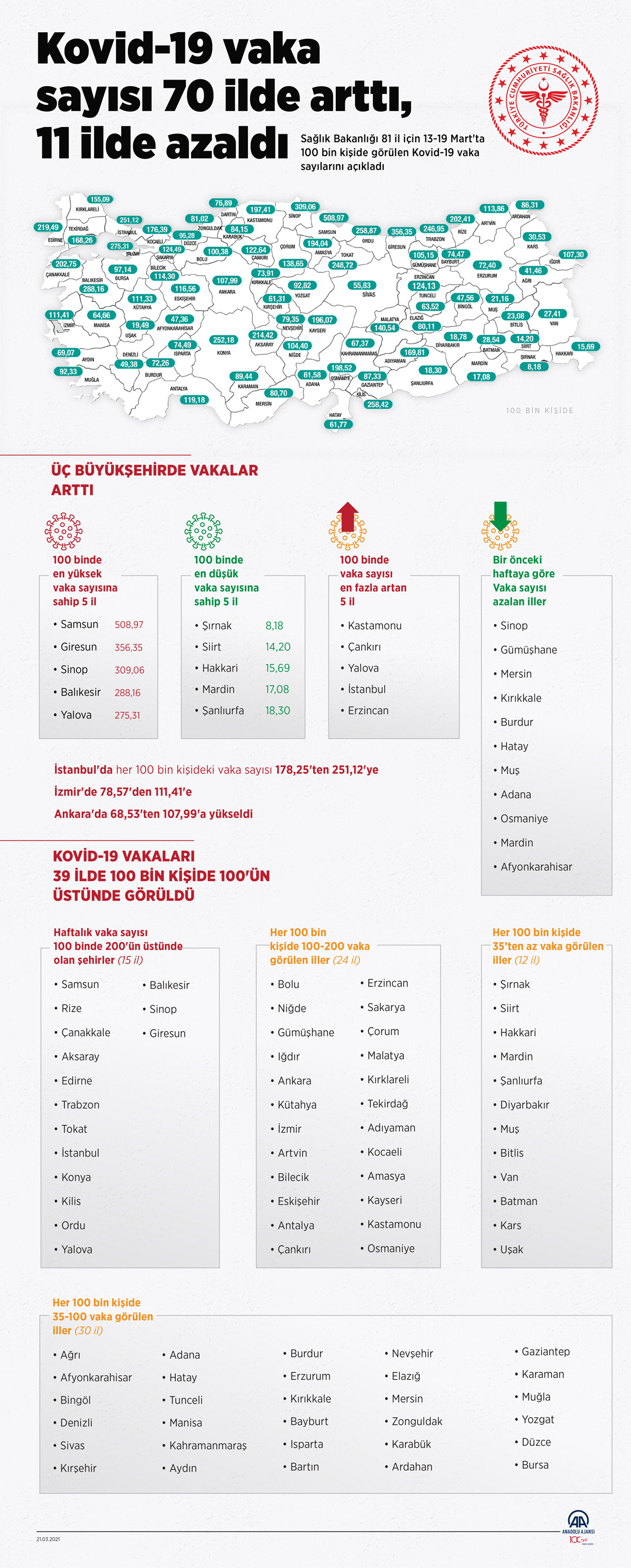 Sağlık Bakanlığınca illerin 13-19 Mart dönemine ait 100 bin kişide görülen Kovid-19 vaka sayısı açıklandı. 70 ilde vaka sayısı artarken, 11 ilde azaldı. ( Mahmut Resul Karaca - Anadolu Ajansı )