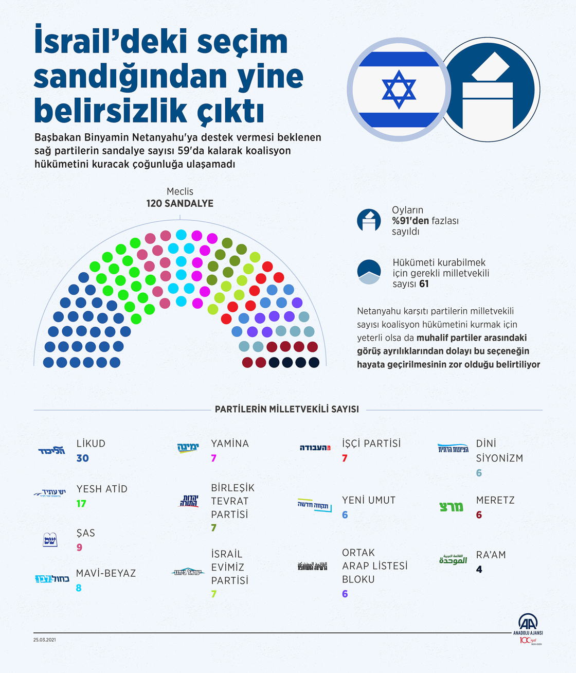 Başbakan Binyamin Netanyahu'ya destek vermesi beklenen sağ partilerin sandalye sayısı 59'da kalarak koalisyon hükümetini kuracak çoğunluğa ulaşamadı. (Grafik: Mahmut Resul Karaca/AA)