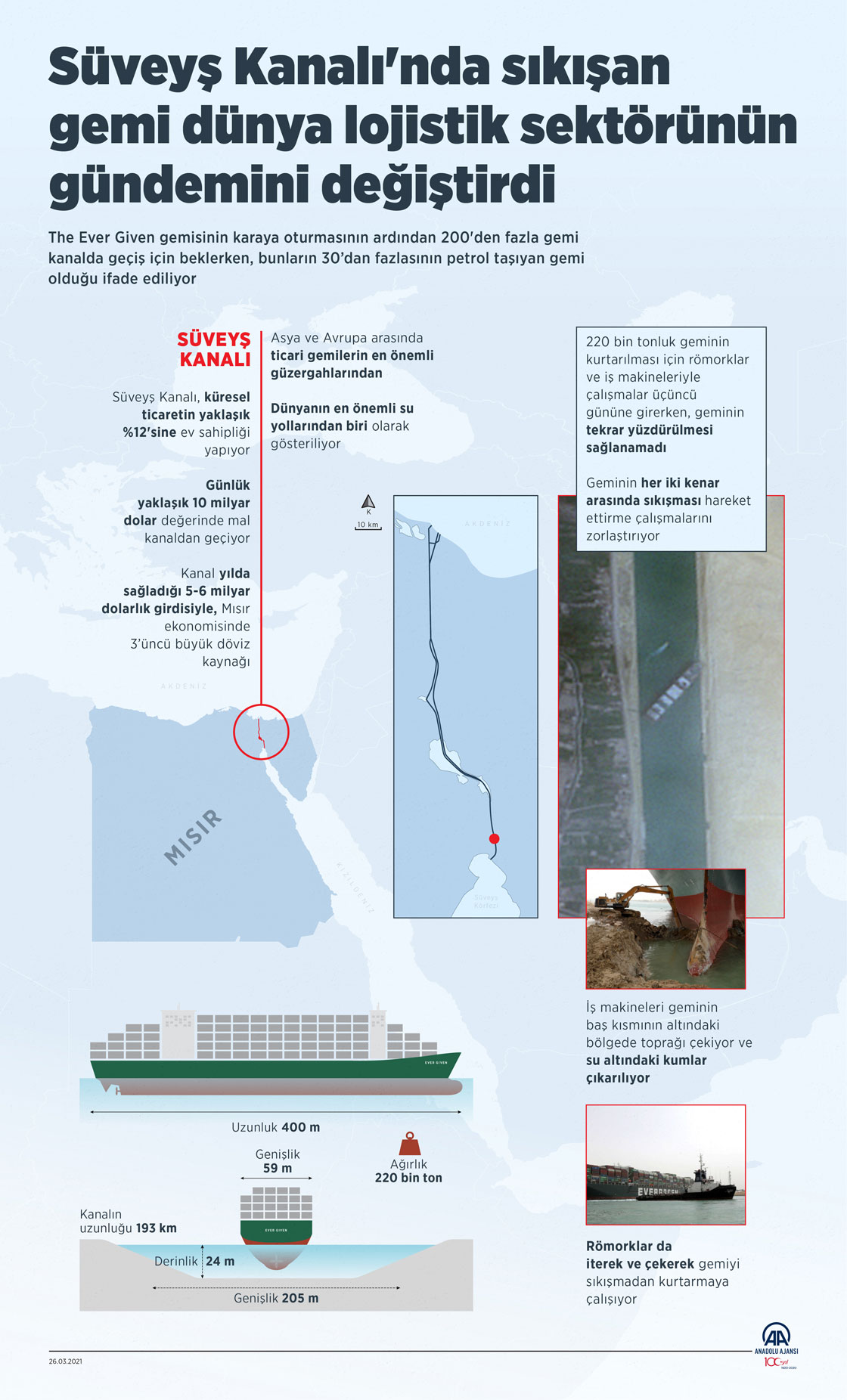Akdeniz’i Kızıldeniz’e bağlayan Süveyş Kanalı'nda karaya oturarak deniz trafiğinin durmasına neden olan "The Ever Given" isimli yük gemisi, yapay su geçidinin "gemilere yakıt tasarrufu sağladığı için" küresel ticarette ve petrol taşımacılığında önemini tekrar gündeme getirdi. ( Yasin Demirci - Anadolu Ajansı )26 Mart 2021•Güncelleme: 26 Mart 2021