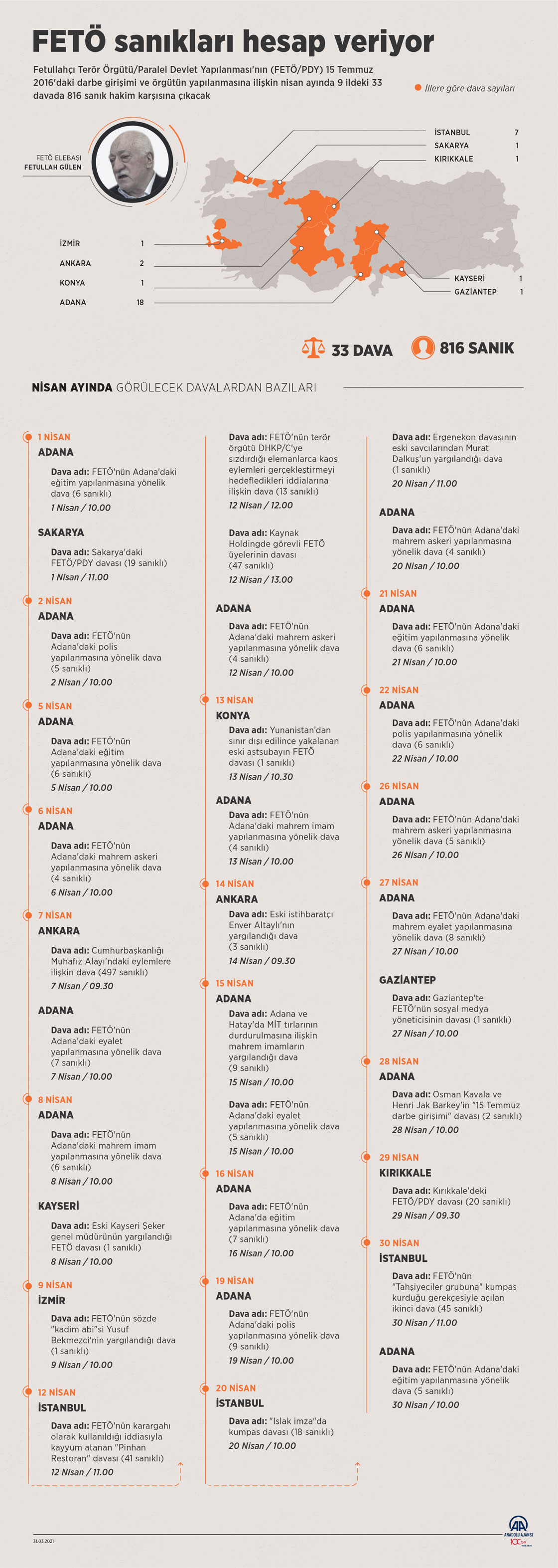 Fetullahçı Terör Örgütü'nün (FETÖ) 15 Temmuz 2016'daki darbe girişimi ve örgütün yapılanmasına ilişkin nisan ayında 9 ildeki 33 davada 816 sanık hakim karşısına çıkacak. ( Kemal Delikmen - Anadolu Ajansı )