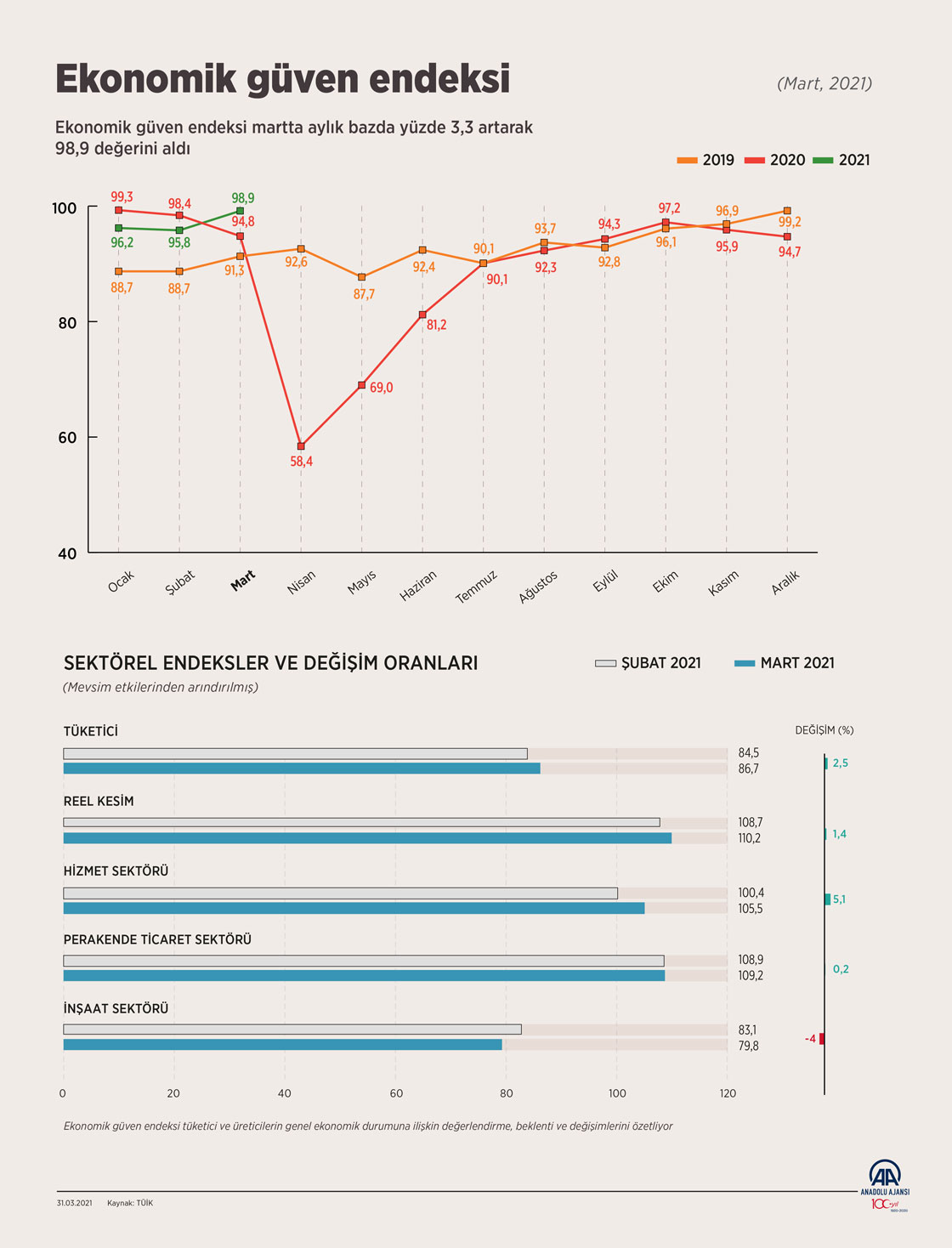 Ekonomik güven endeksi martta aylık bazda yüzde 3,3 artarak 98,9 değerini aldı. ( Yılmaz Yücel - Anadolu Ajansı )