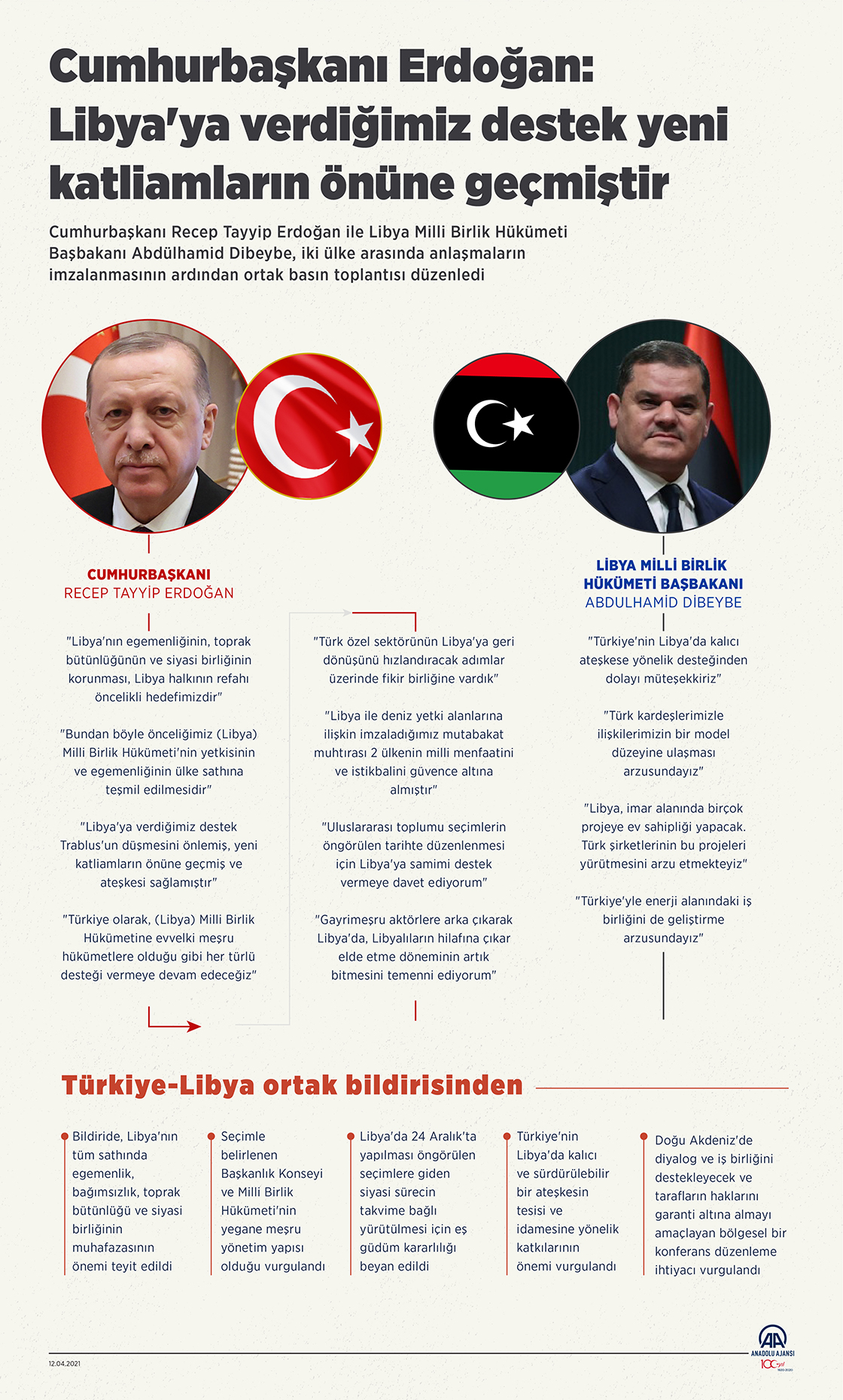 Cumhurbaşkanı Recep Tayyip Erdoğan, "Libya'nın egemenliğinin, toprak bütünlüğünün ve siyasi birliğinin korunması, Libya halkının refahı öncelikli hedefimizdir." dedi. ( Mahmut Resul Karaca - Anadolu Ajansı )13 Nisan 2021•Güncelleme: 13 Nisan 2021