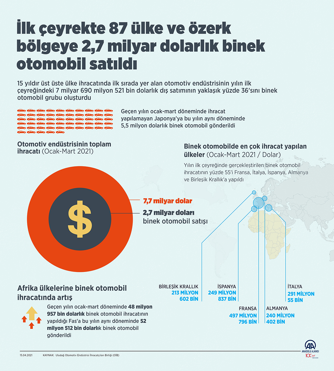 Türkiye'den yılın ilk çeyreğinde 87 ülke, özerk ve serbest bölgeye 2 milyar 734 milyon 641 bin dolarlık binek otomobil satışı gerçekleştirildi.