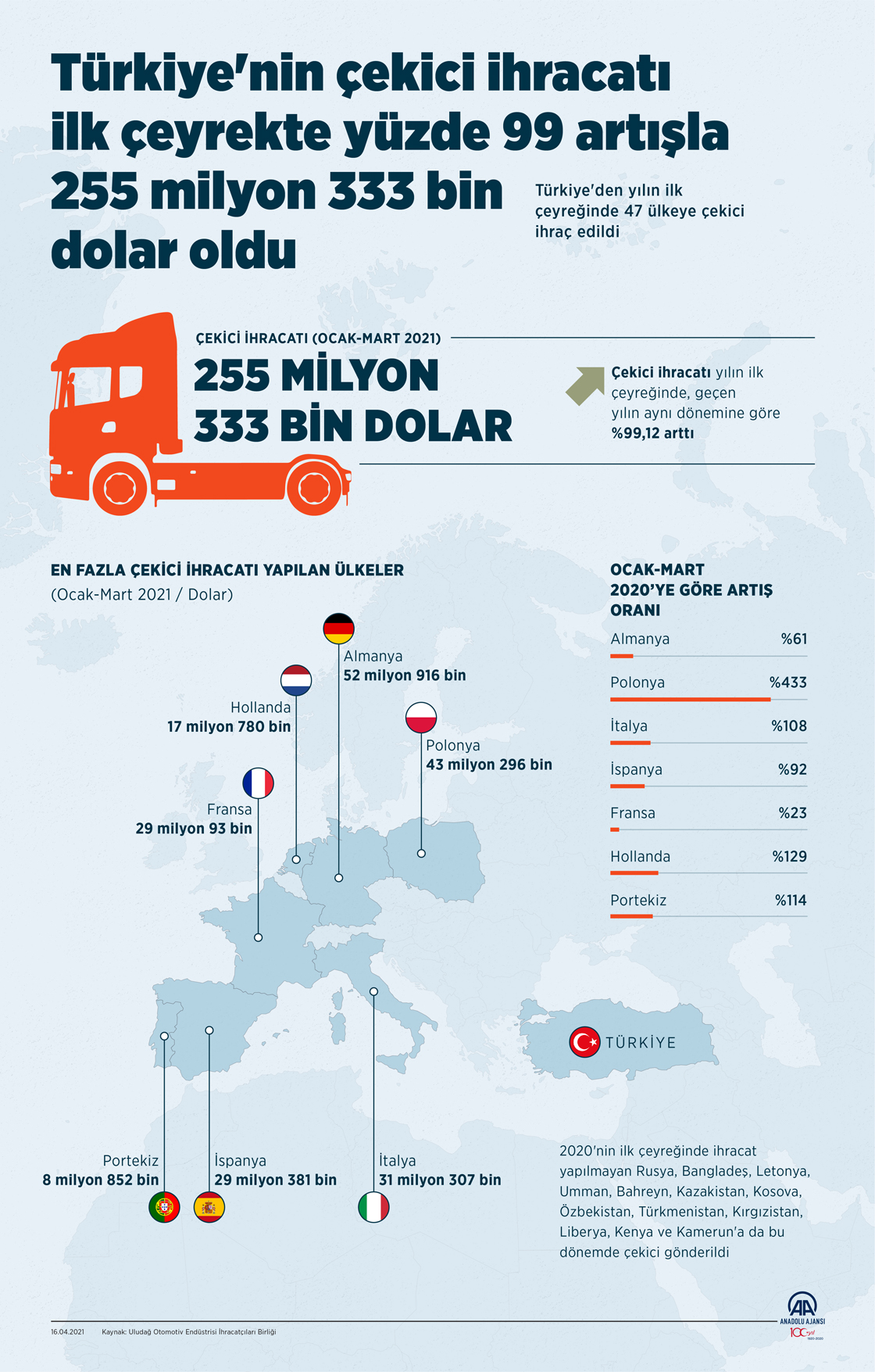 Türkiye'nin çekici ihracatı ilk çeyrekte yüzde 99 artışla 255 milyon 333 bin dolar oldu