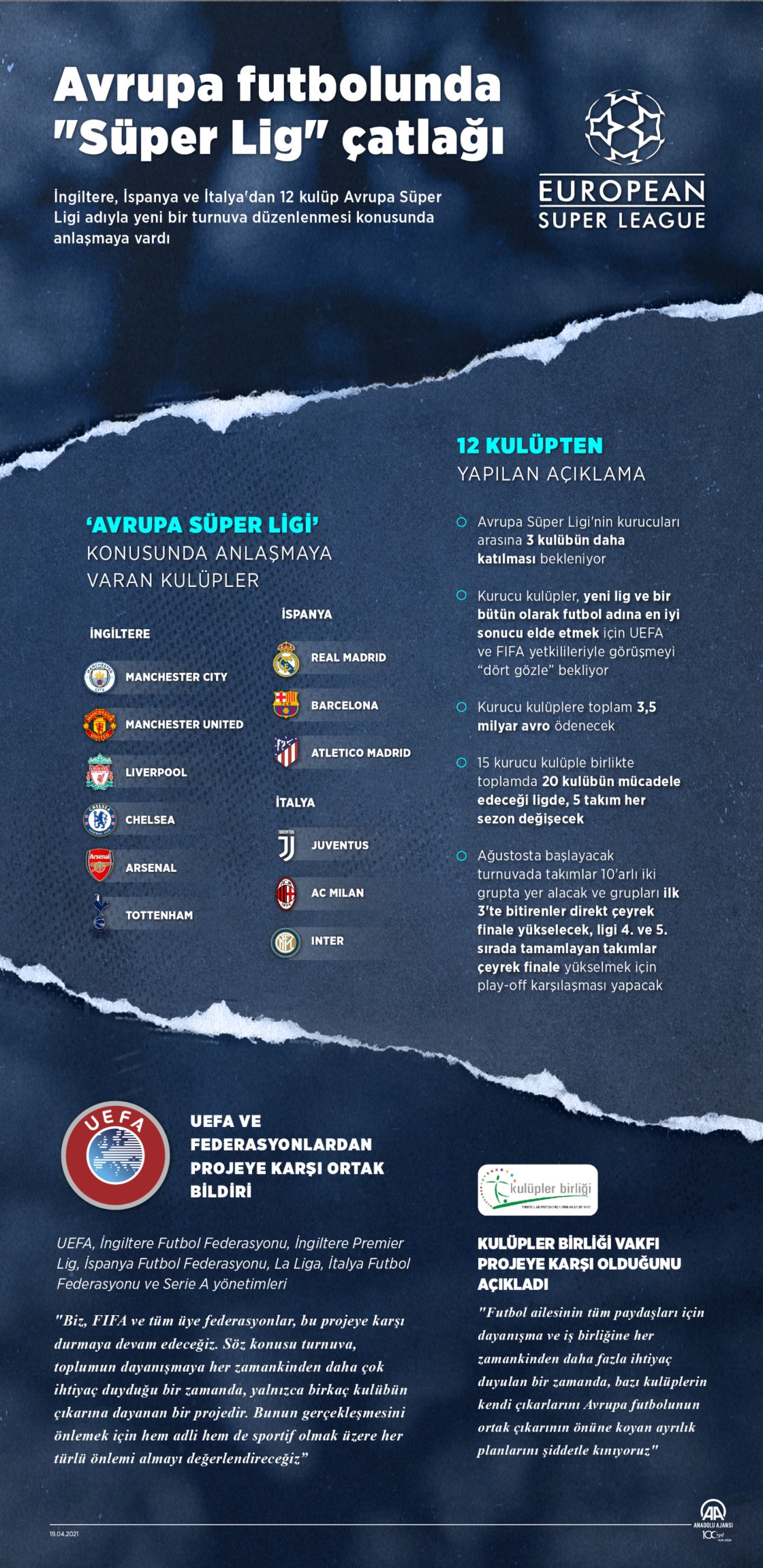 İngiltere, İspanya ve İtalya'dan 12 kulübün "Avrupa Süper Ligi" adıyla yeni bir turnuva düzenlenmesi konusunda anlaşmaya vardığı bildirildi.