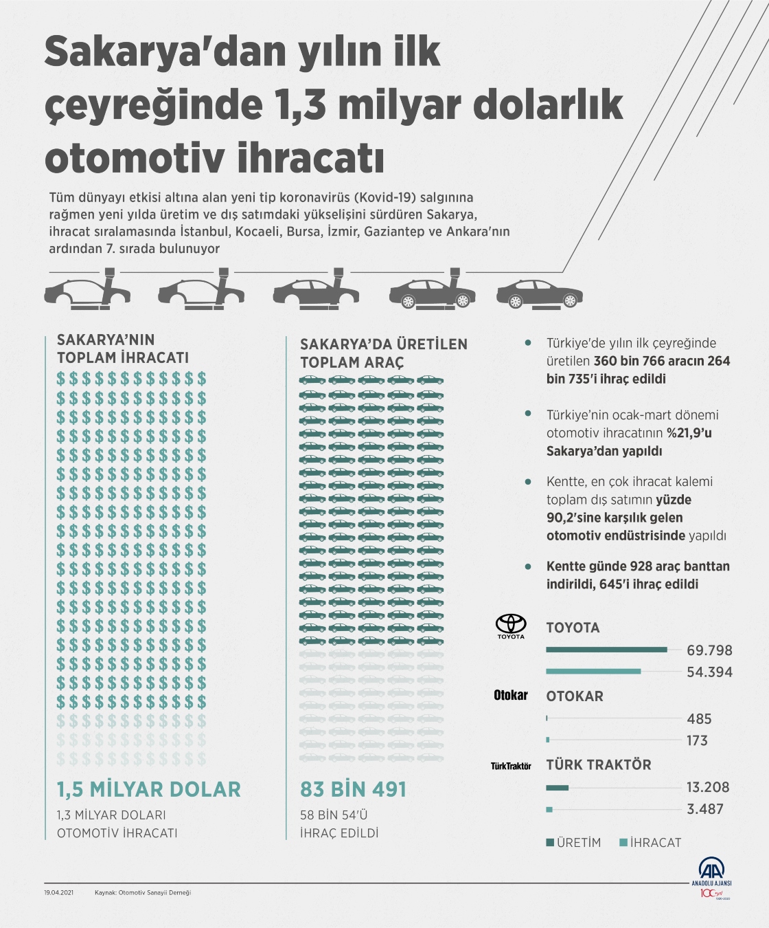 Türkiye'nin önde gelen otomotiv firmalarına ev sahipliği yapan Sakarya'da, yılın ilk çeyreğinde üretilen 83 bin 491 aracın 58 bin 54'ü ihraç edildi, 1 milyar 287 milyon 916 bin dolar gelir sağlandı. (Anadolu Ajansı - Omar Zaghloul)19 Nisan 2021•Güncelleme: 19 Nisan 2021