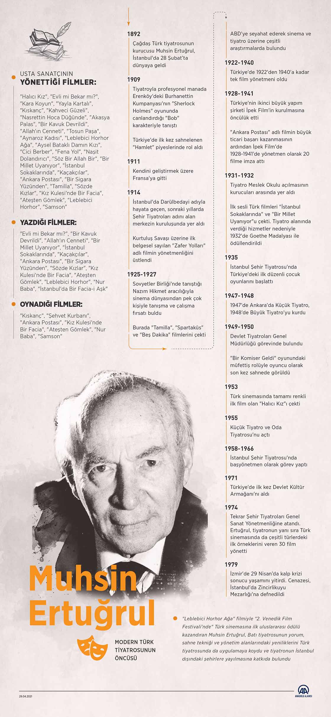 "Leblebici Horhor Ağa" filmiyle "2. Venedik Film Festivali'nde" Türk sinemasına ilk uluslararası ödülü kazandıran Muhsin Ertuğrul, Batı tiyatrosunun yorum, sahne tekniği ve yönetim alanlarındaki yeniliklerini Türk tiyatrosunda da uygulamaya koydu ve tiyatronun İstanbul dışındaki şehirlere yayılmasına katkıda bulundu.29 Nisan 2021•Güncelleme: 29 Nisan 2021
